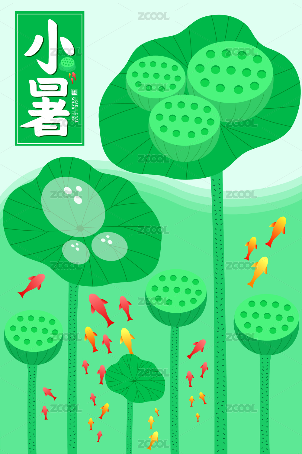 綠色清新荷葉蓮蓬錦鯉小暑海報