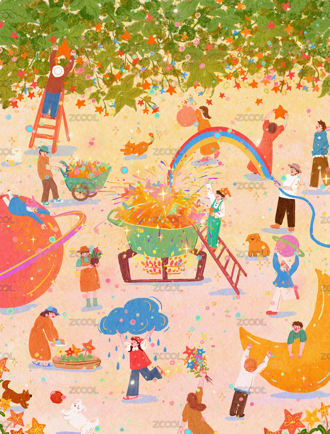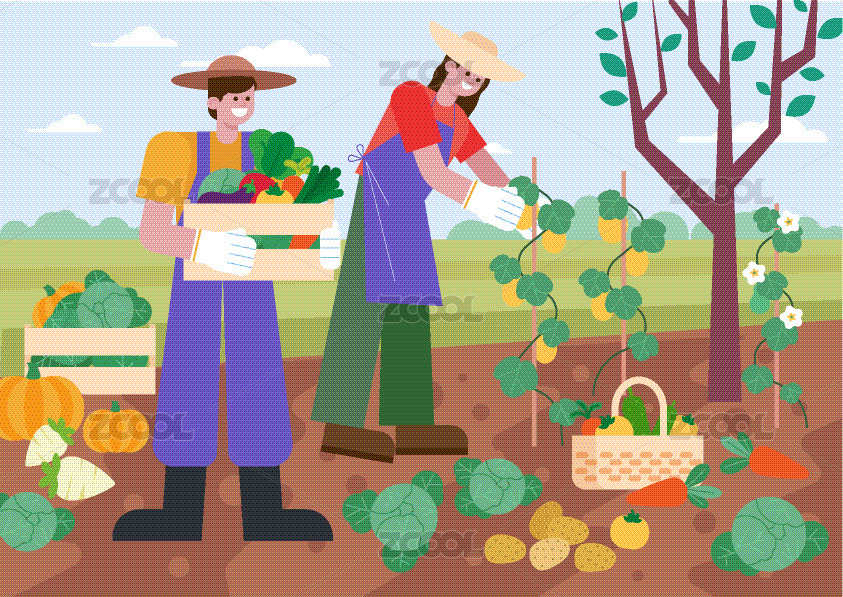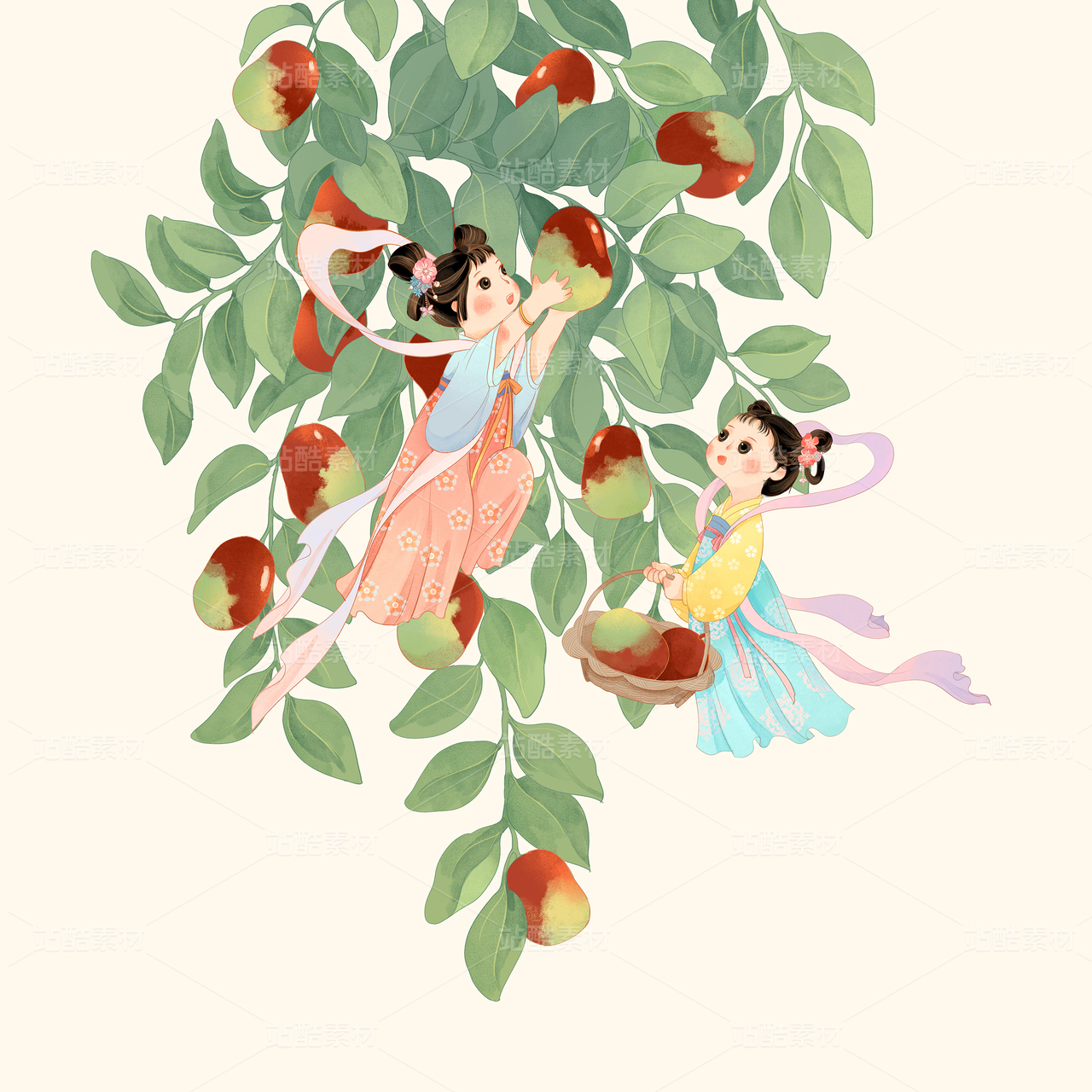 兩個(gè)唐朝服飾小仙女采摘青棗與棗樹水果國潮插畫
