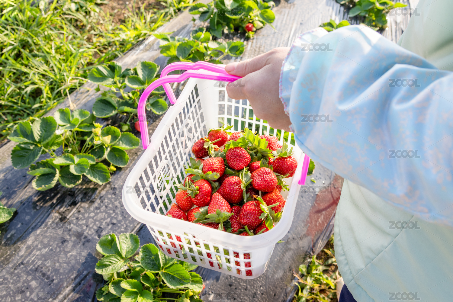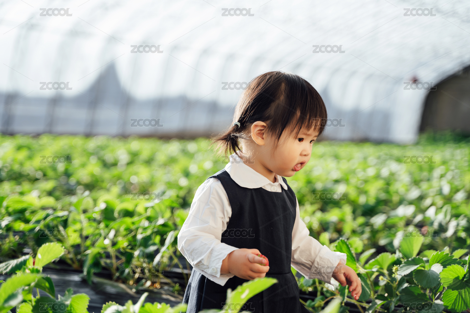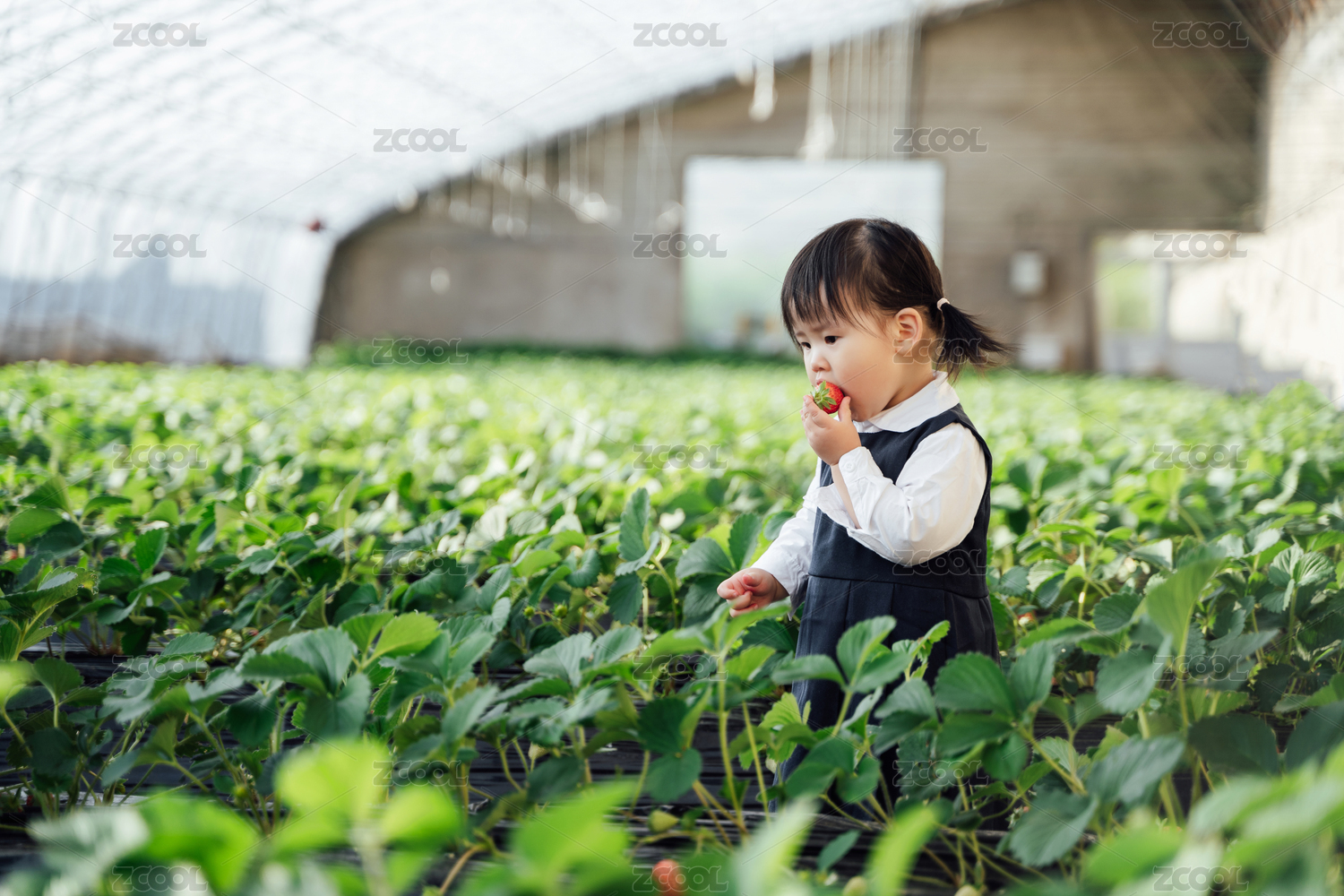 可愛的亞洲小女孩在草莓農(nóng)場采摘新鮮的