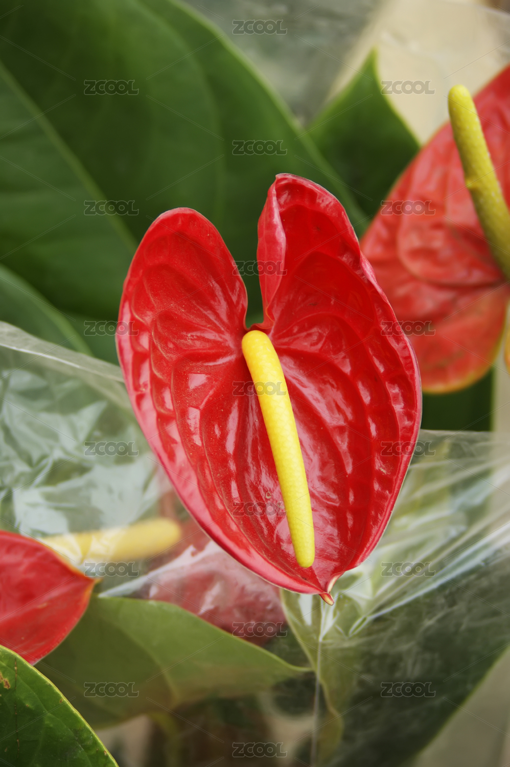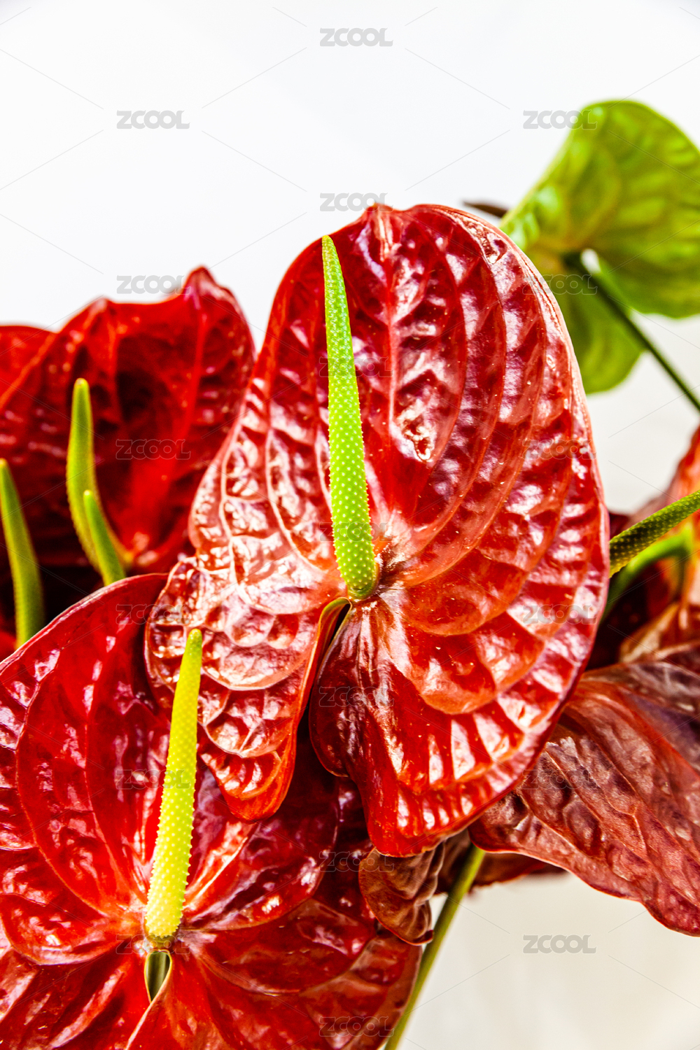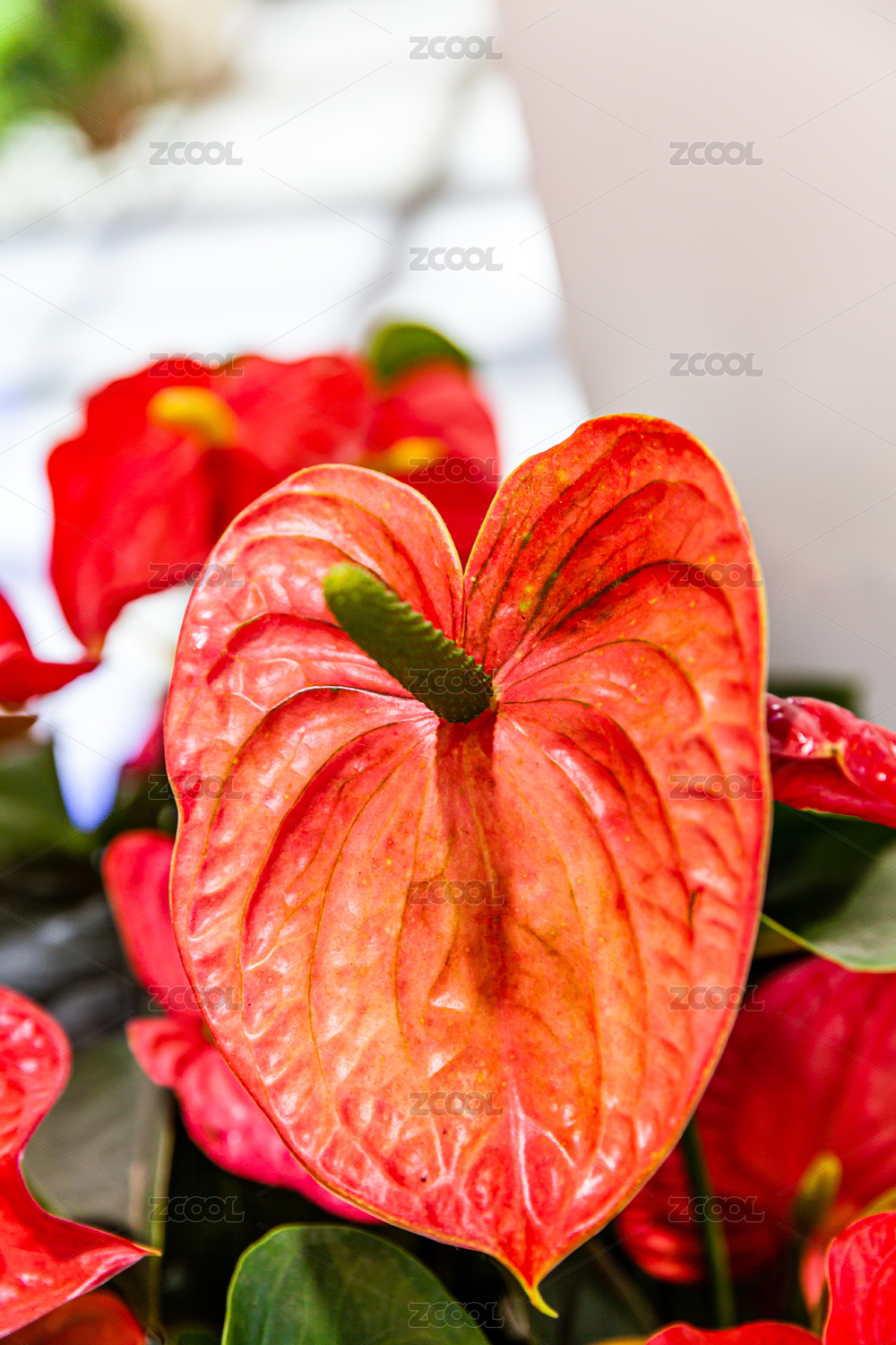 特寫紅掌花綠色葉子