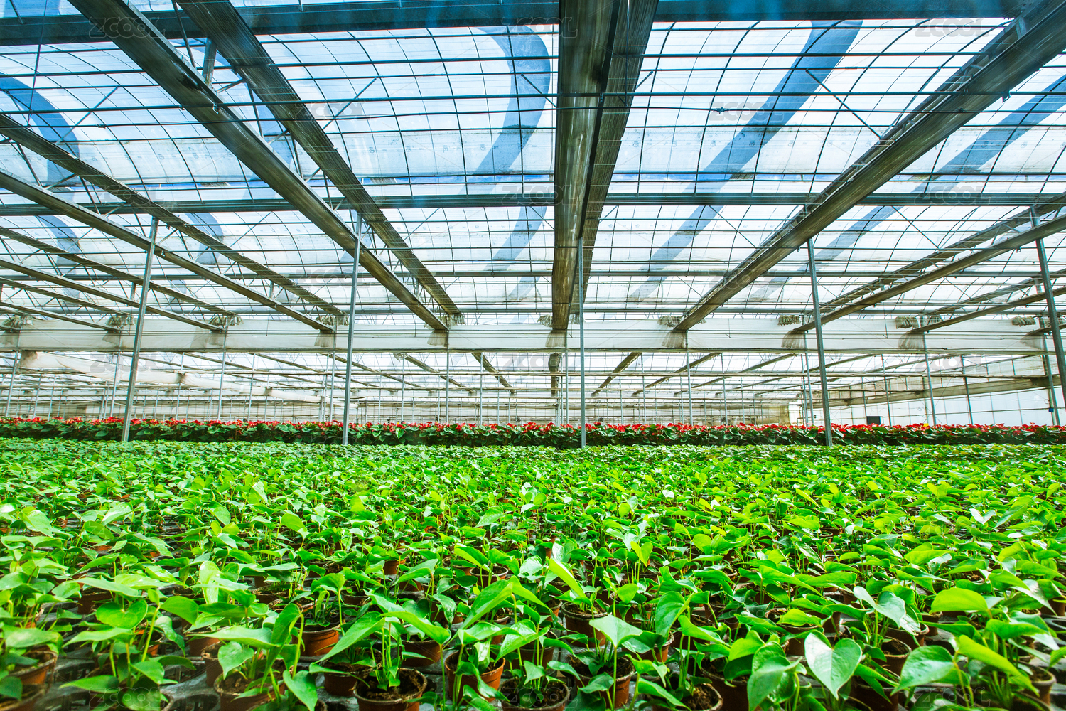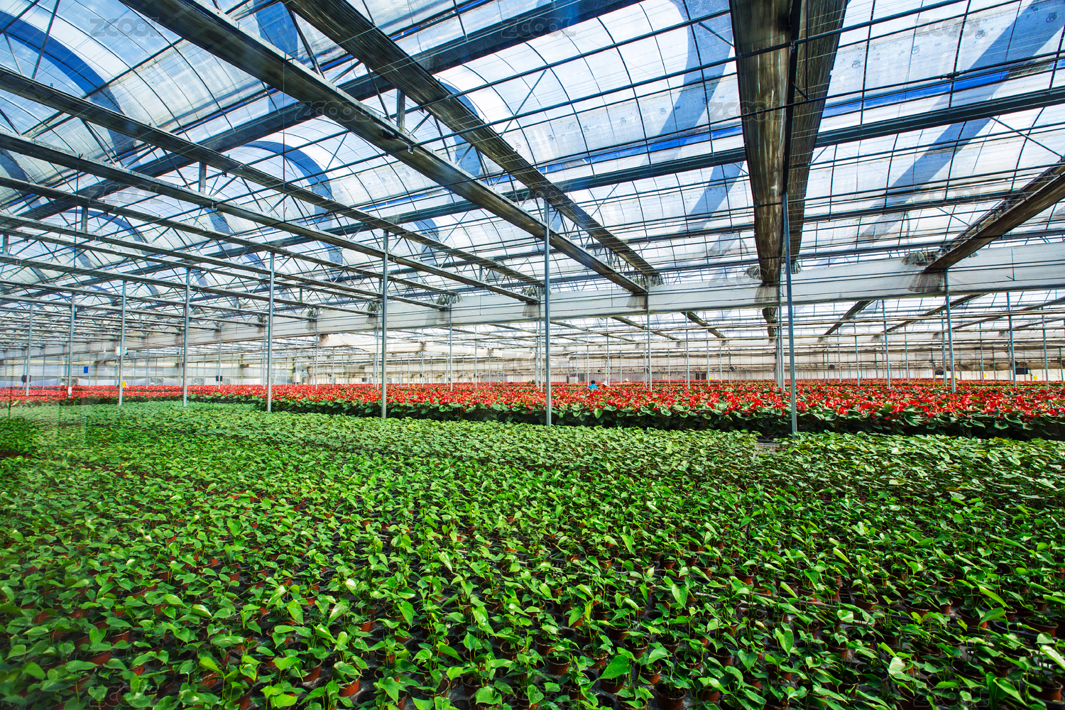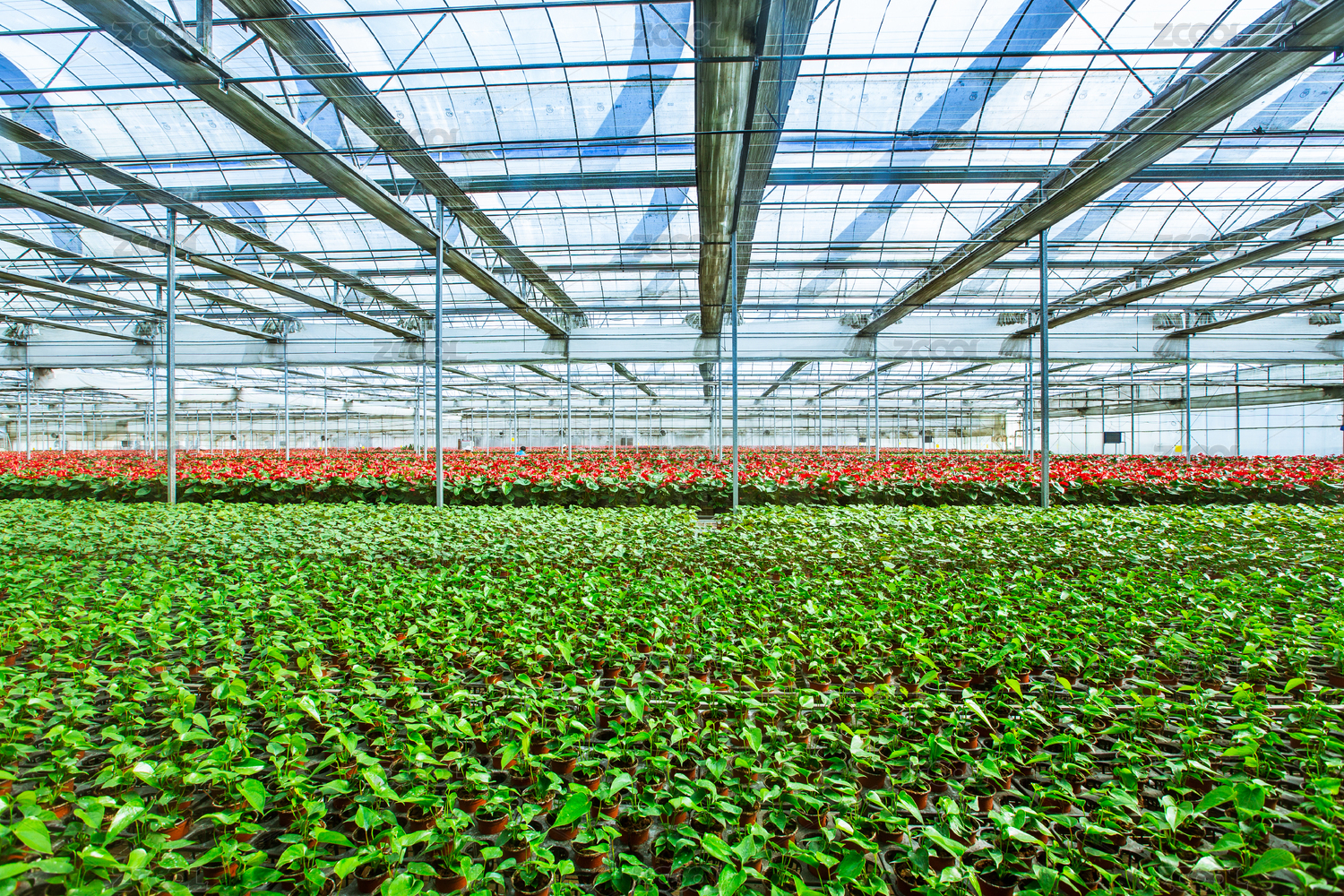鋼架大棚內(nèi)成片種植的紅掌花卉