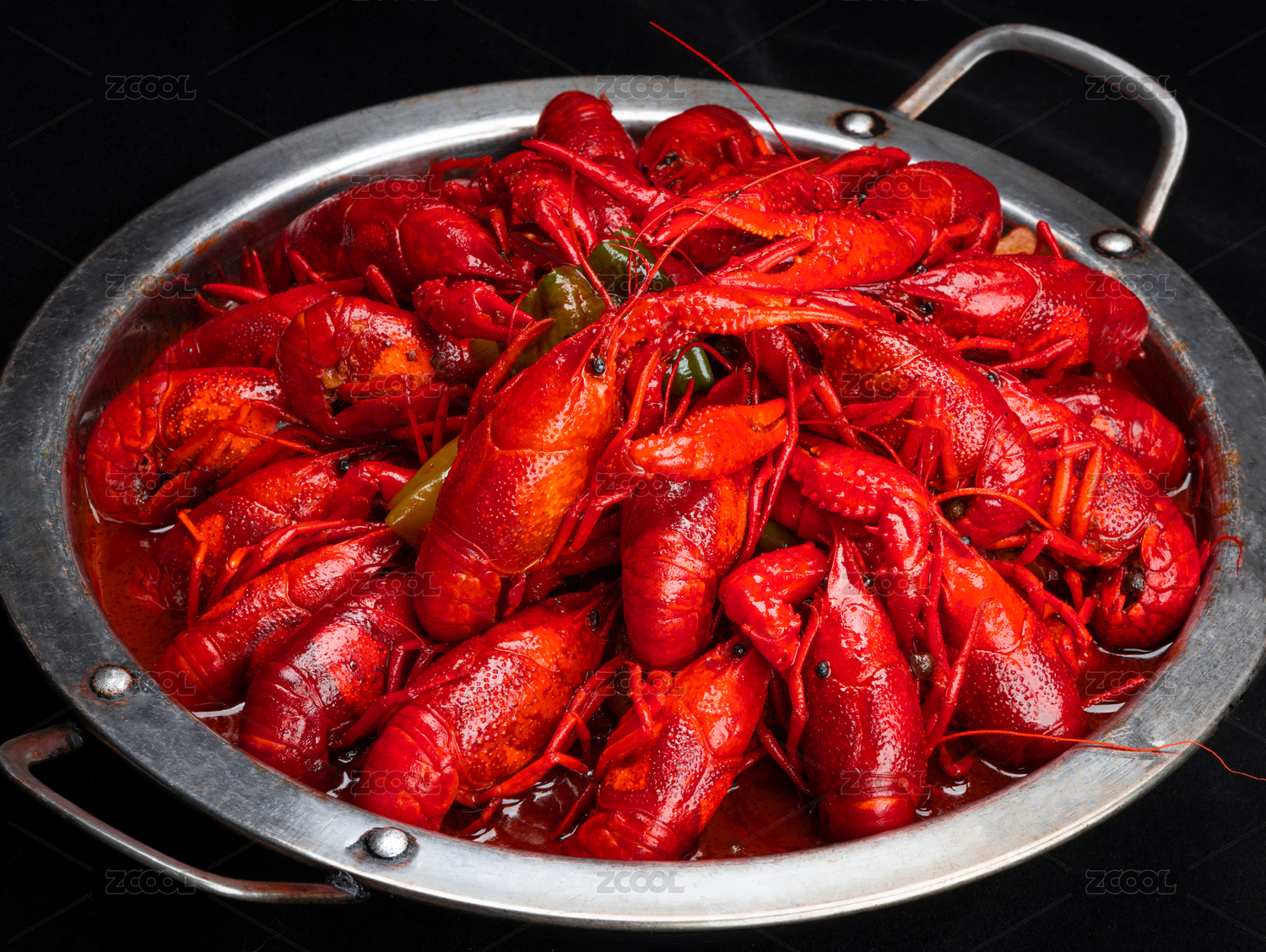 黑色背景下盛滿一盆的紅燒小龍蝦
