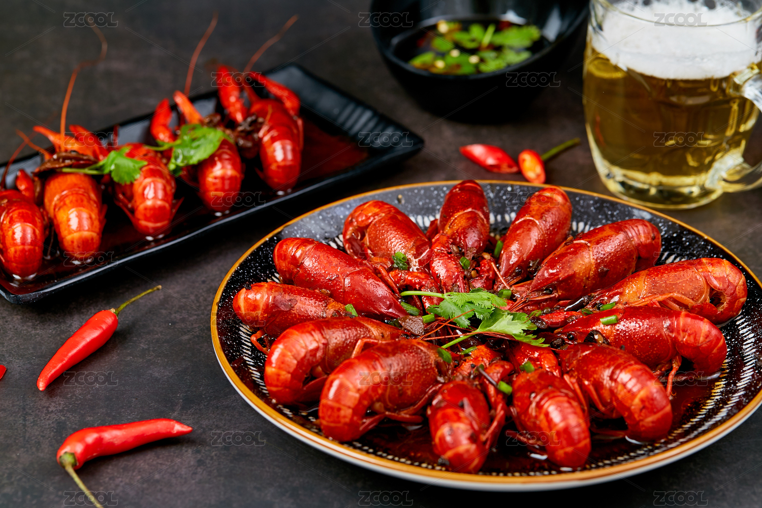 深色背景下的麻辣十三香小龍蝦和啤酒