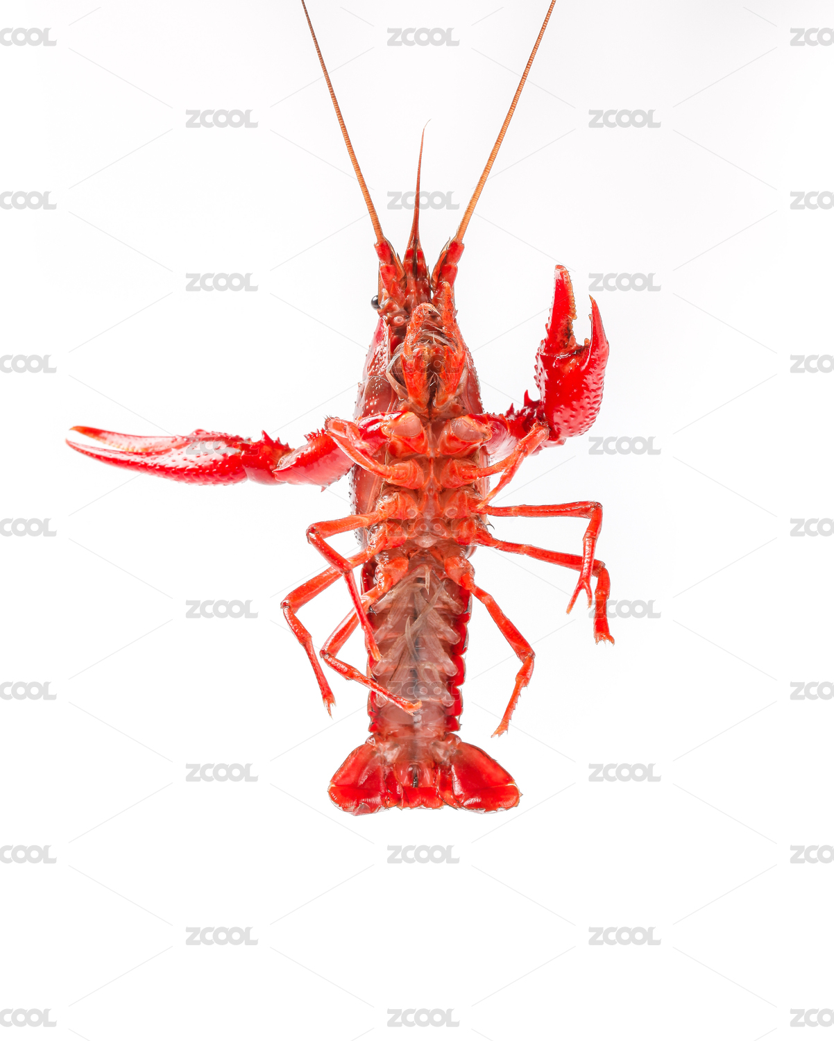 白底上頭朝上尾朝下的小龍蝦腹部展示