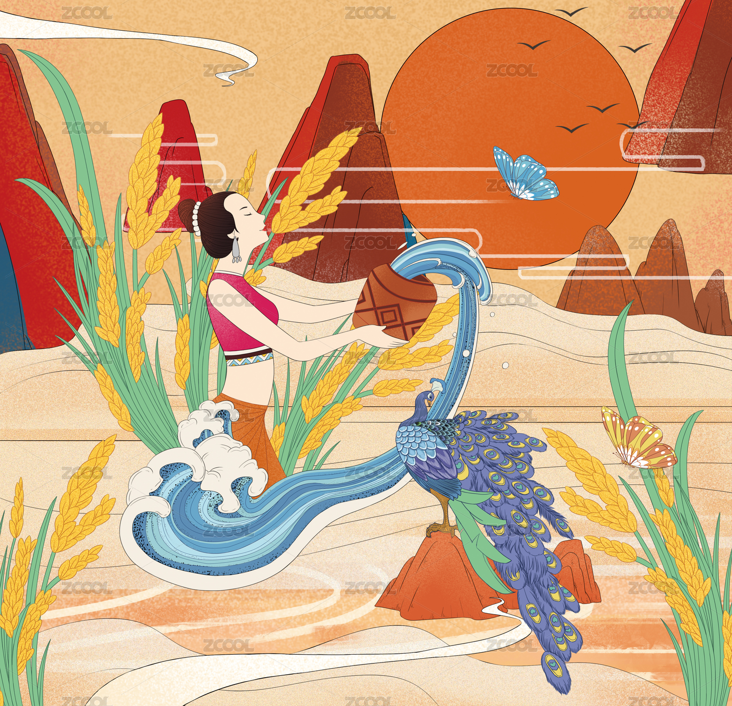 傣族大米孔雀手繪插畫(huà)