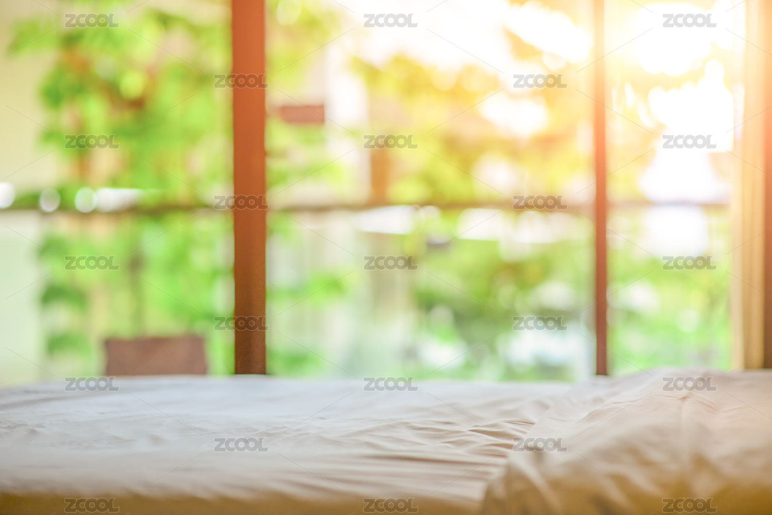 陽光穿過窗戶照在明亮通透溫暖的潔凈的床上