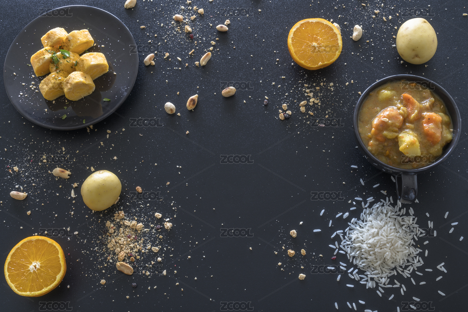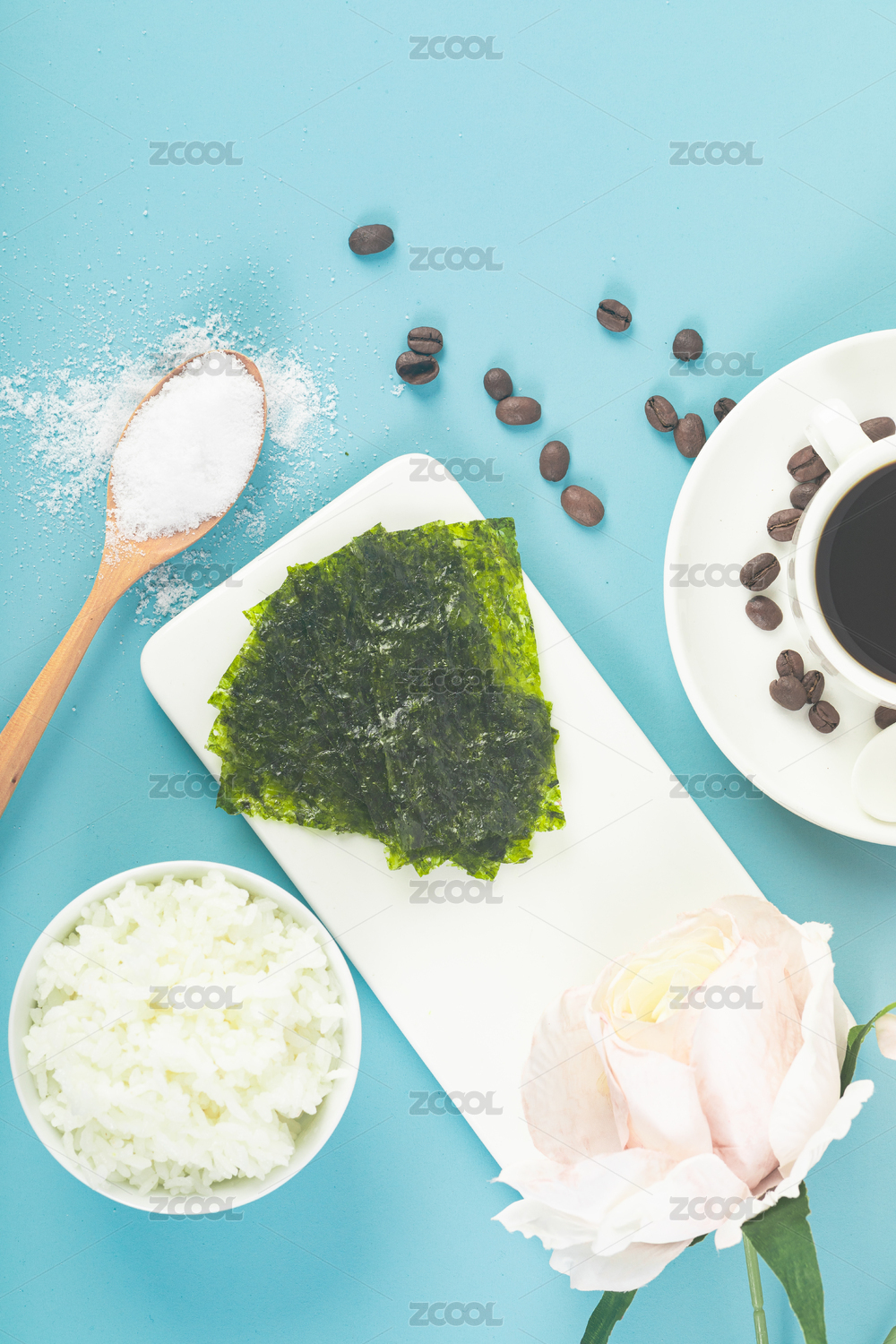 白色盤子上擺放的綠色海苔片和米飯食鹽俯拍