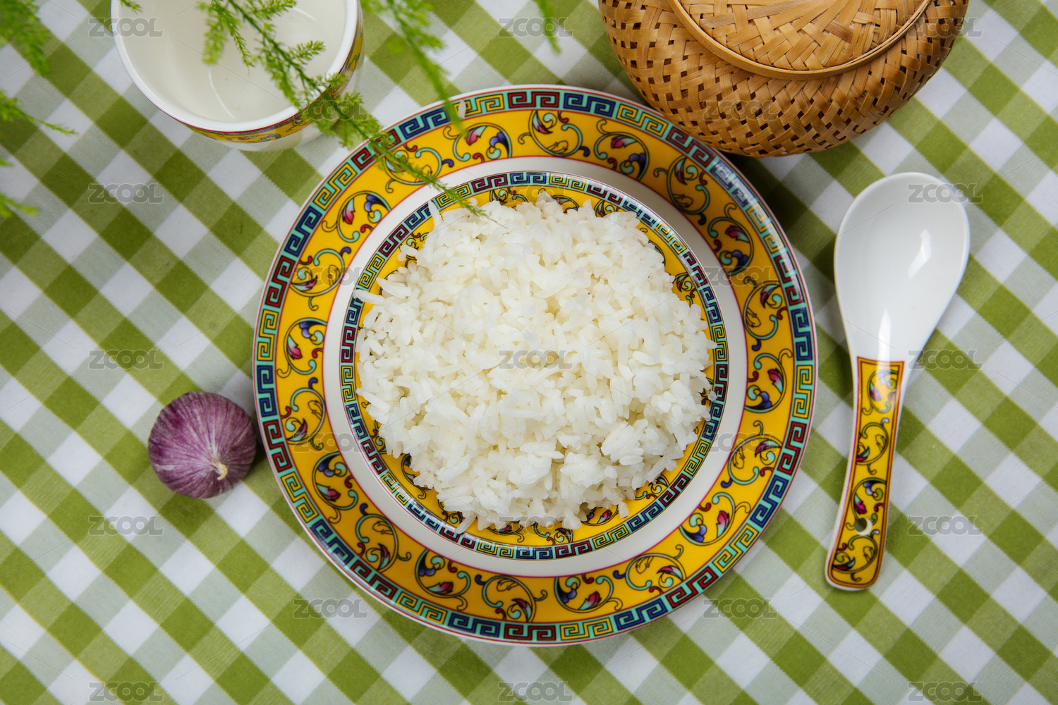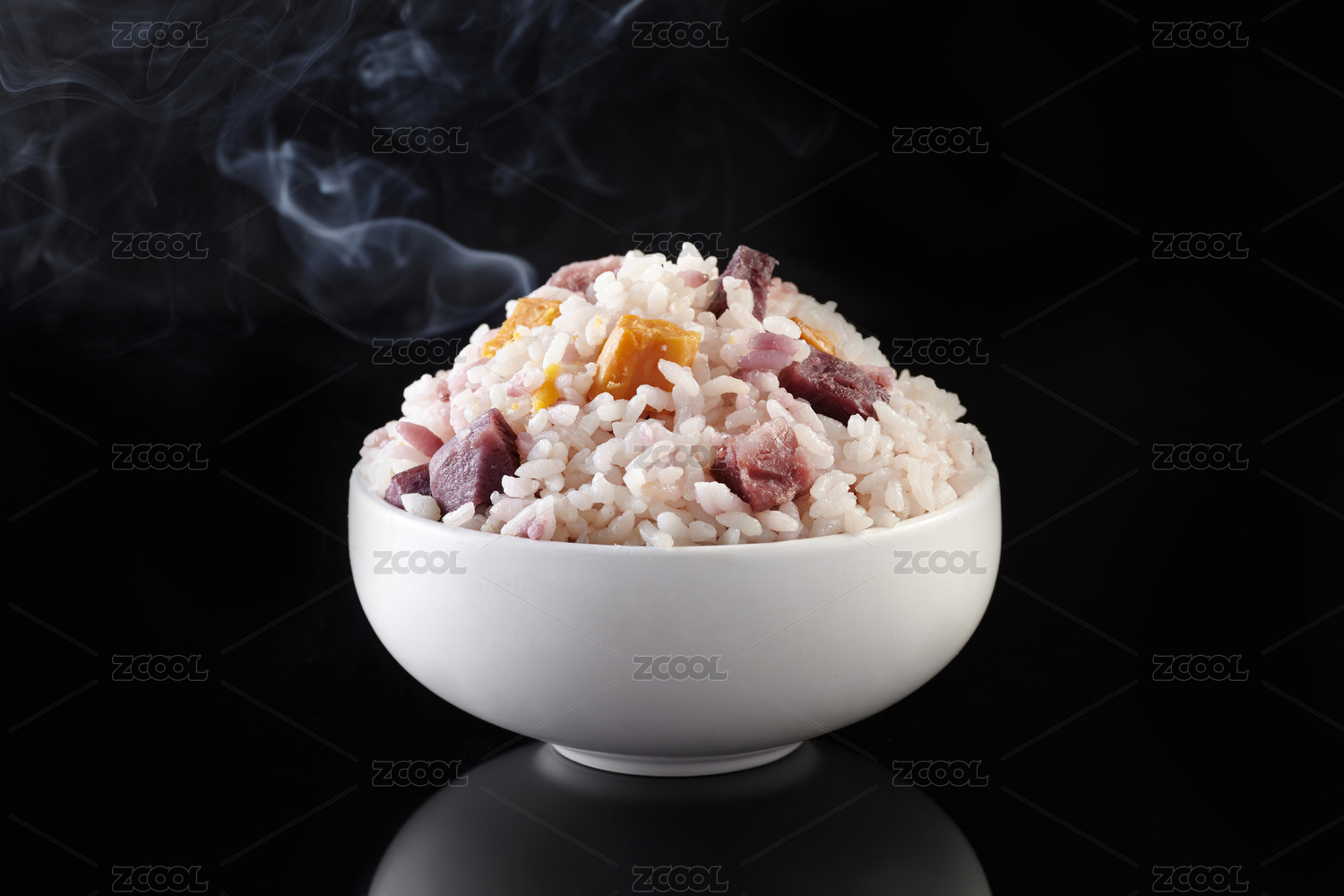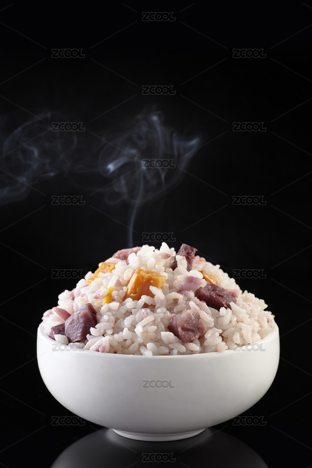 白色碗裝的冒著熱氣的巧手紫薯白米飯
