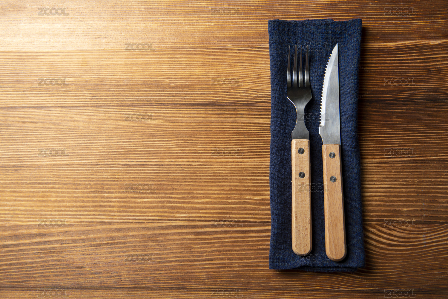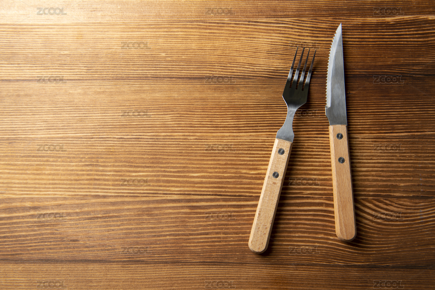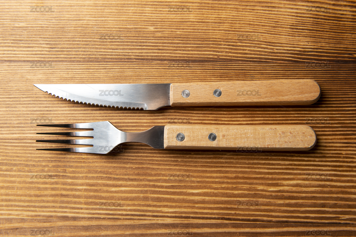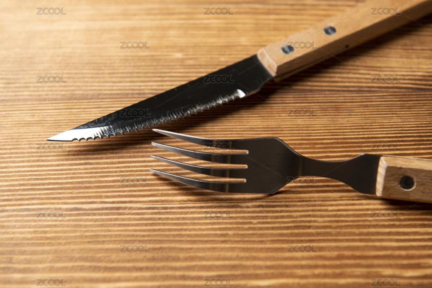 擺放在木桌面上的刀叉特寫(xiě)