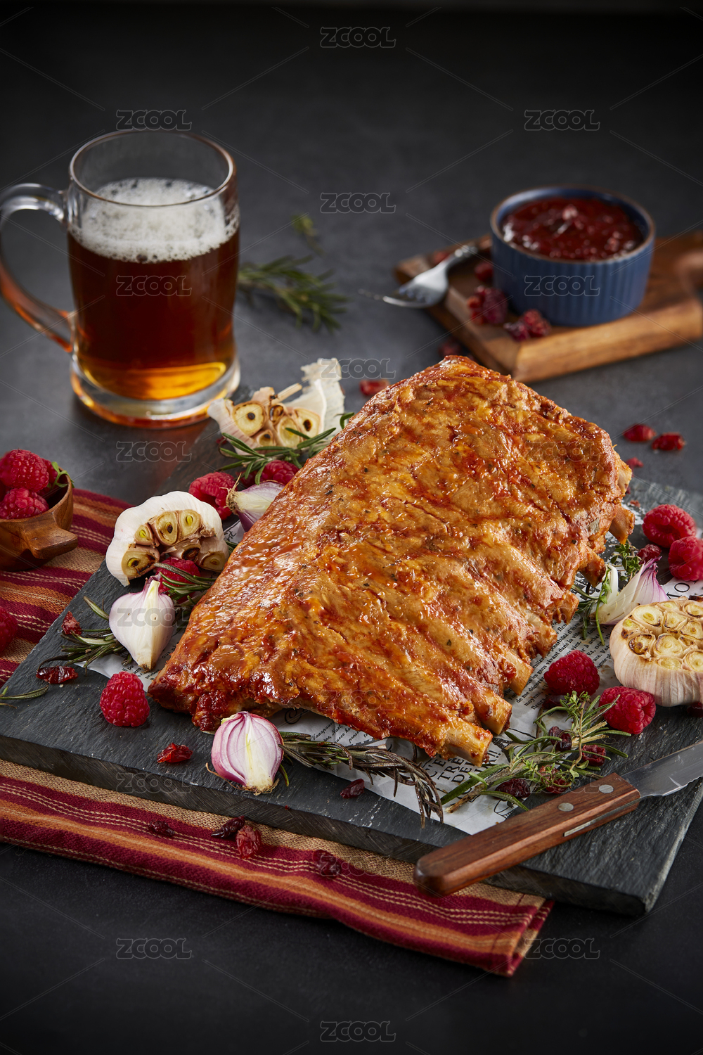 西餐美食烤豬排配啤酒