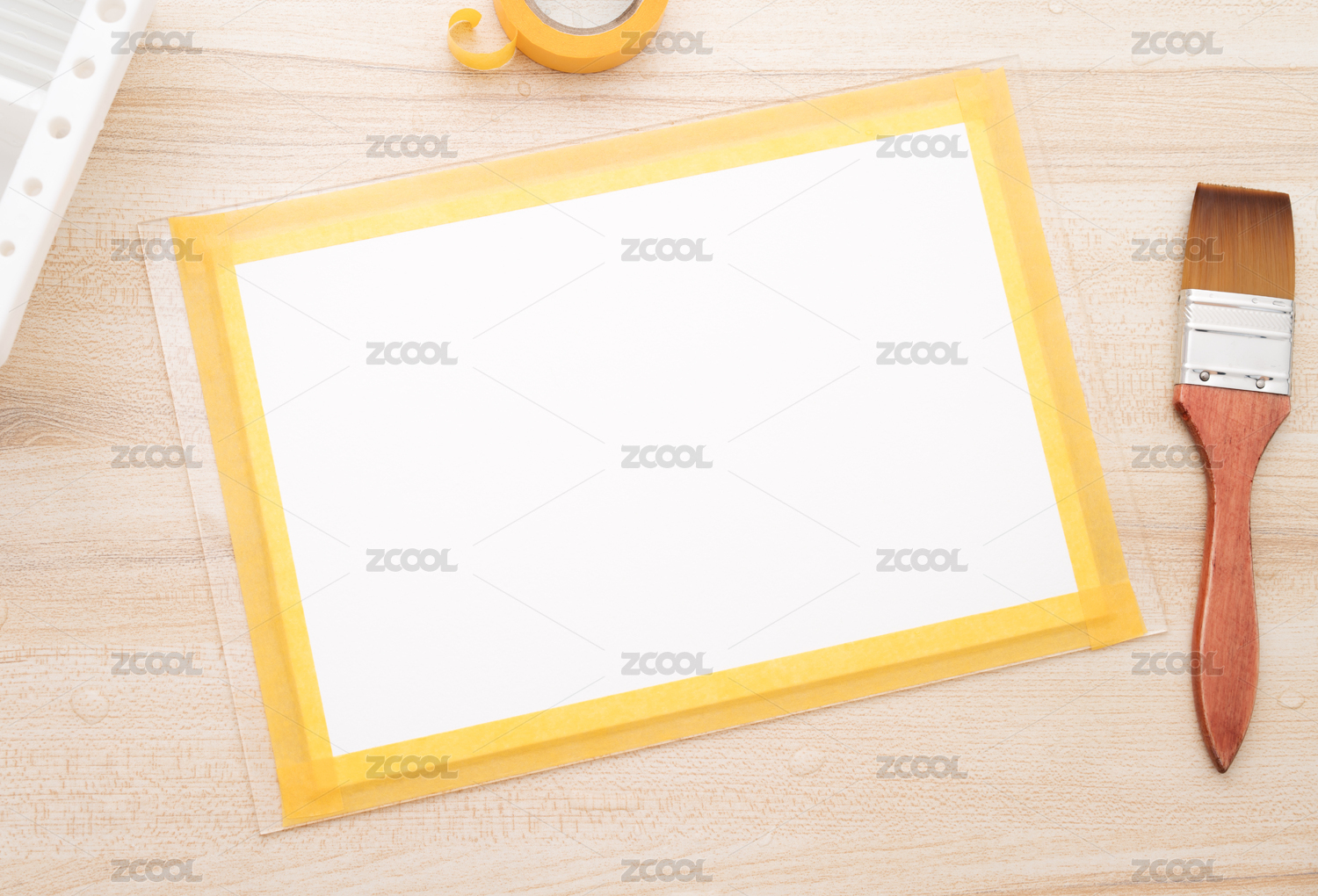 黃色的木質(zhì)桌面上放著空白的白色畫(huà)紙和刷子等文具