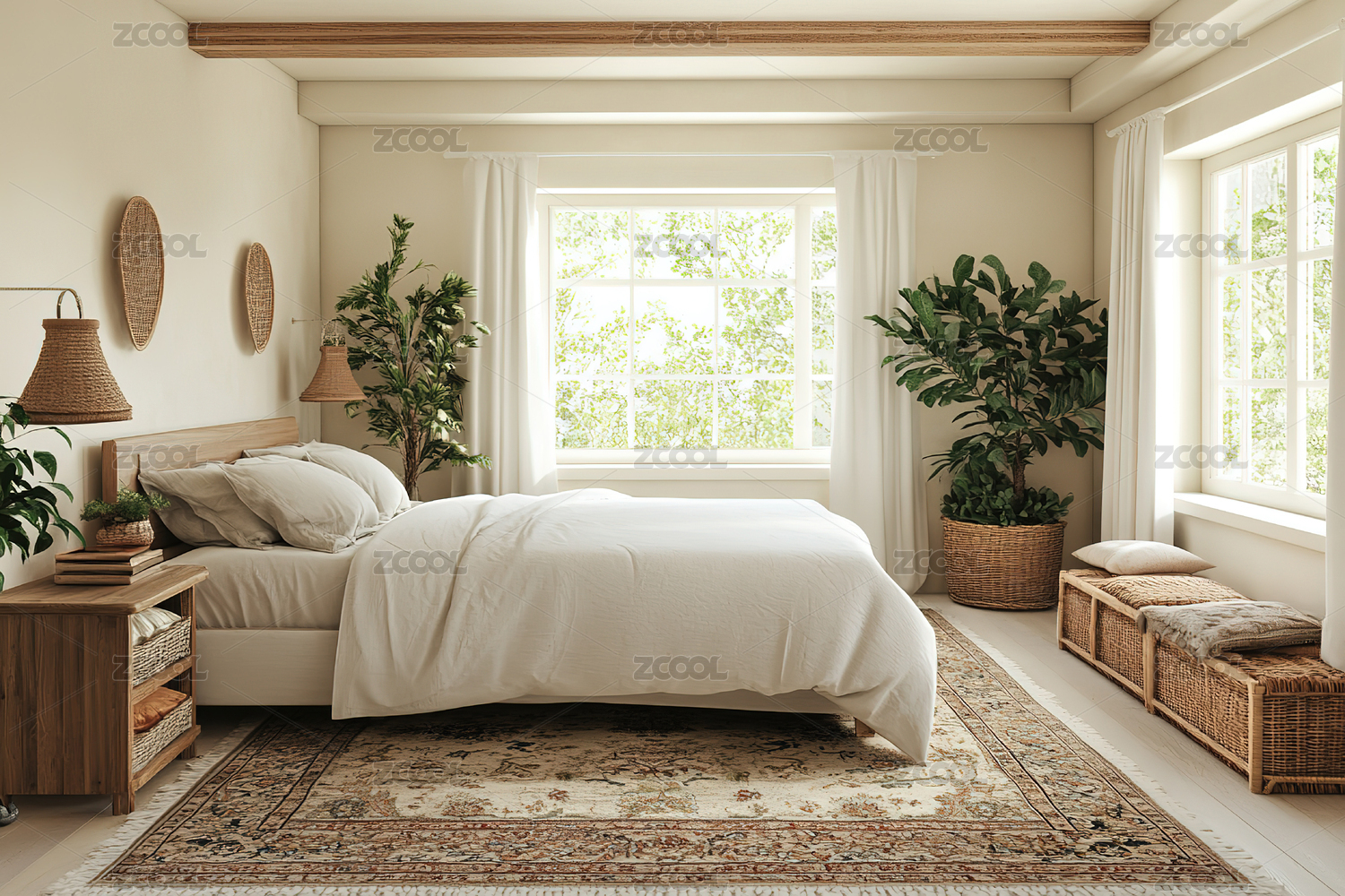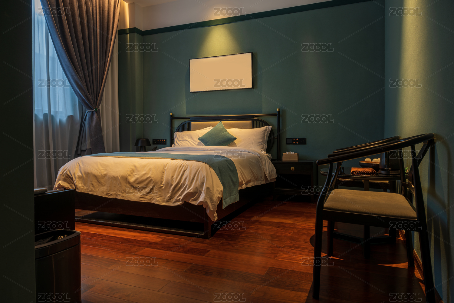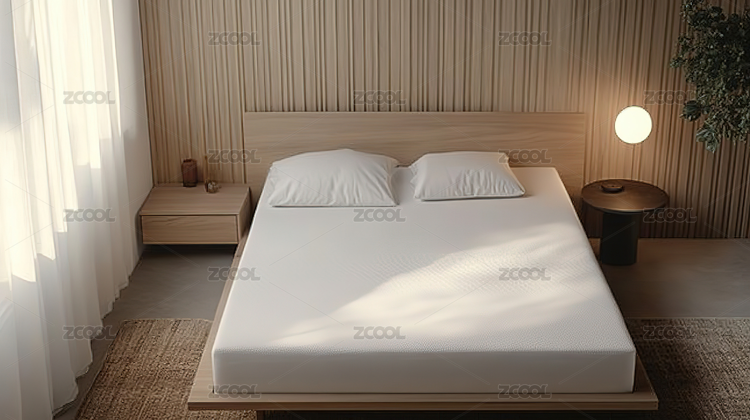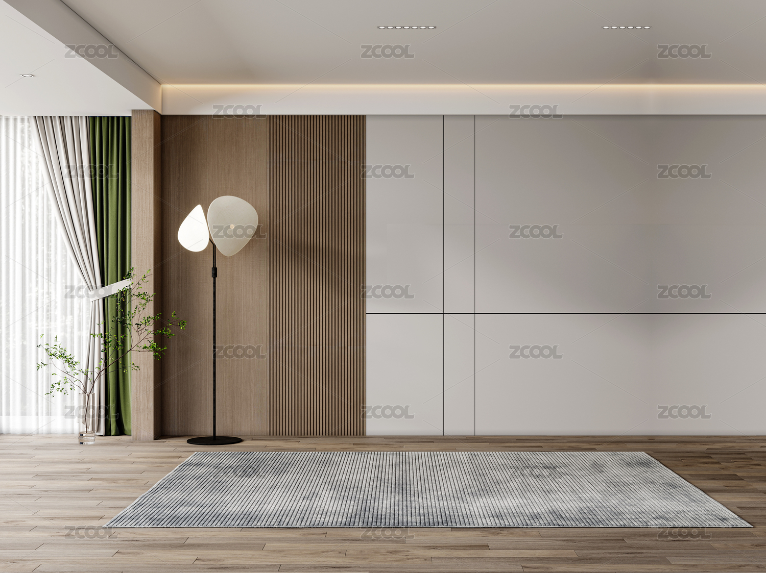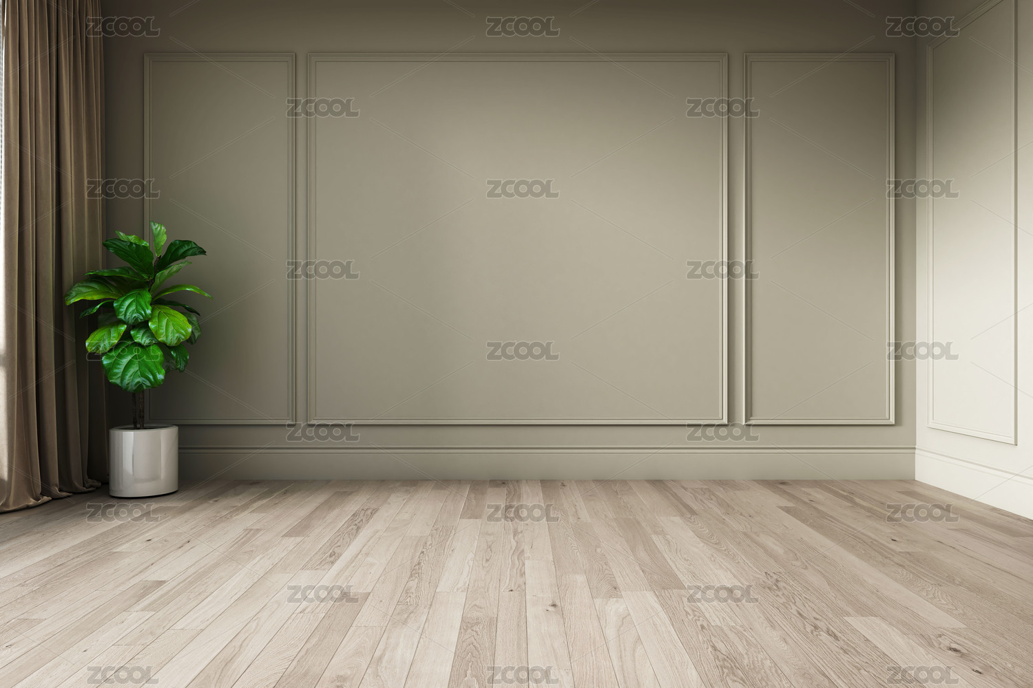 室內(nèi)空間臥室背景墻綠植窗簾木地板3d渲染