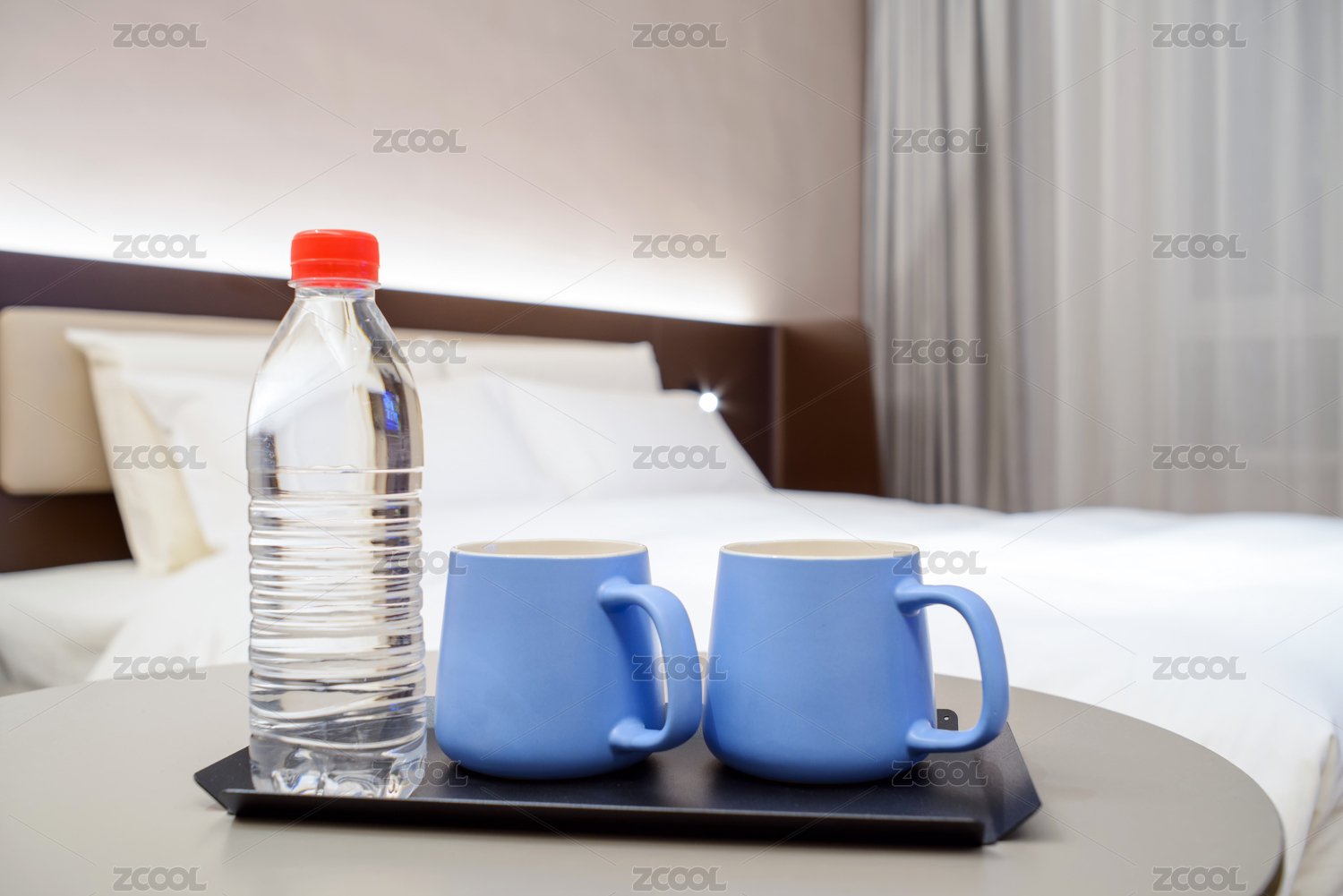 酒店客房內(nèi)桌子上的咖啡杯礦泉水
