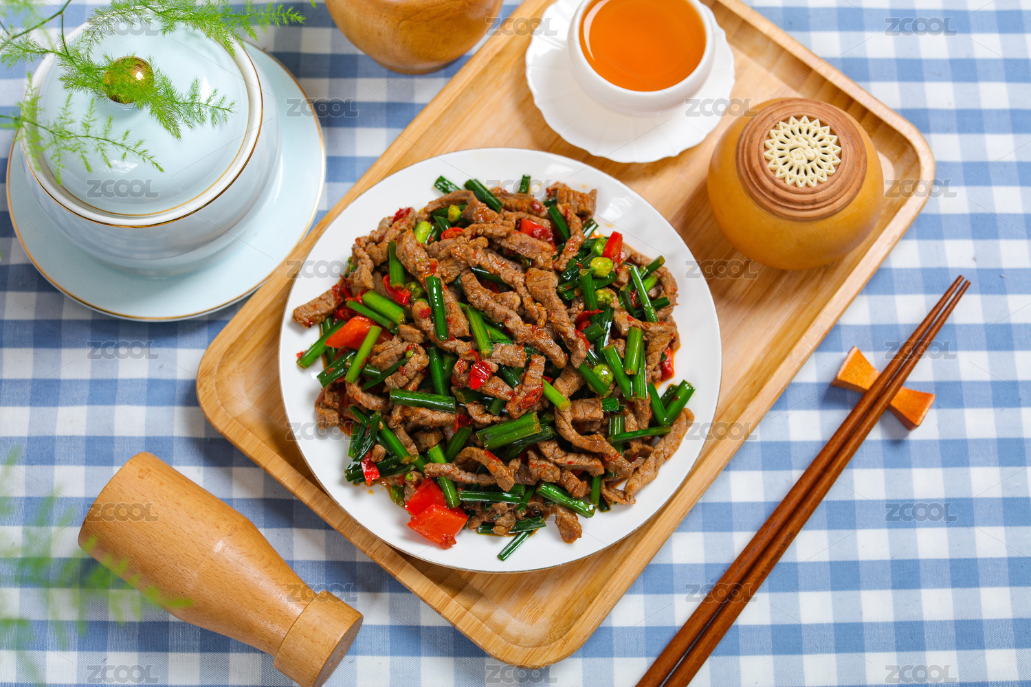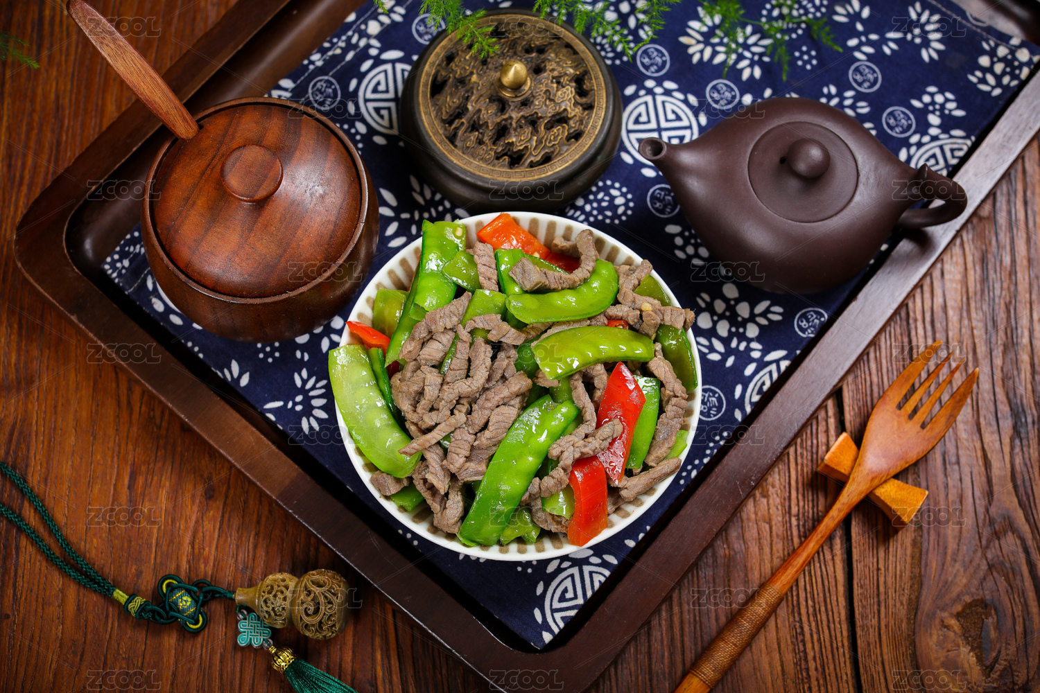 桌面上的木紋盤子里的香菇牛肉絲