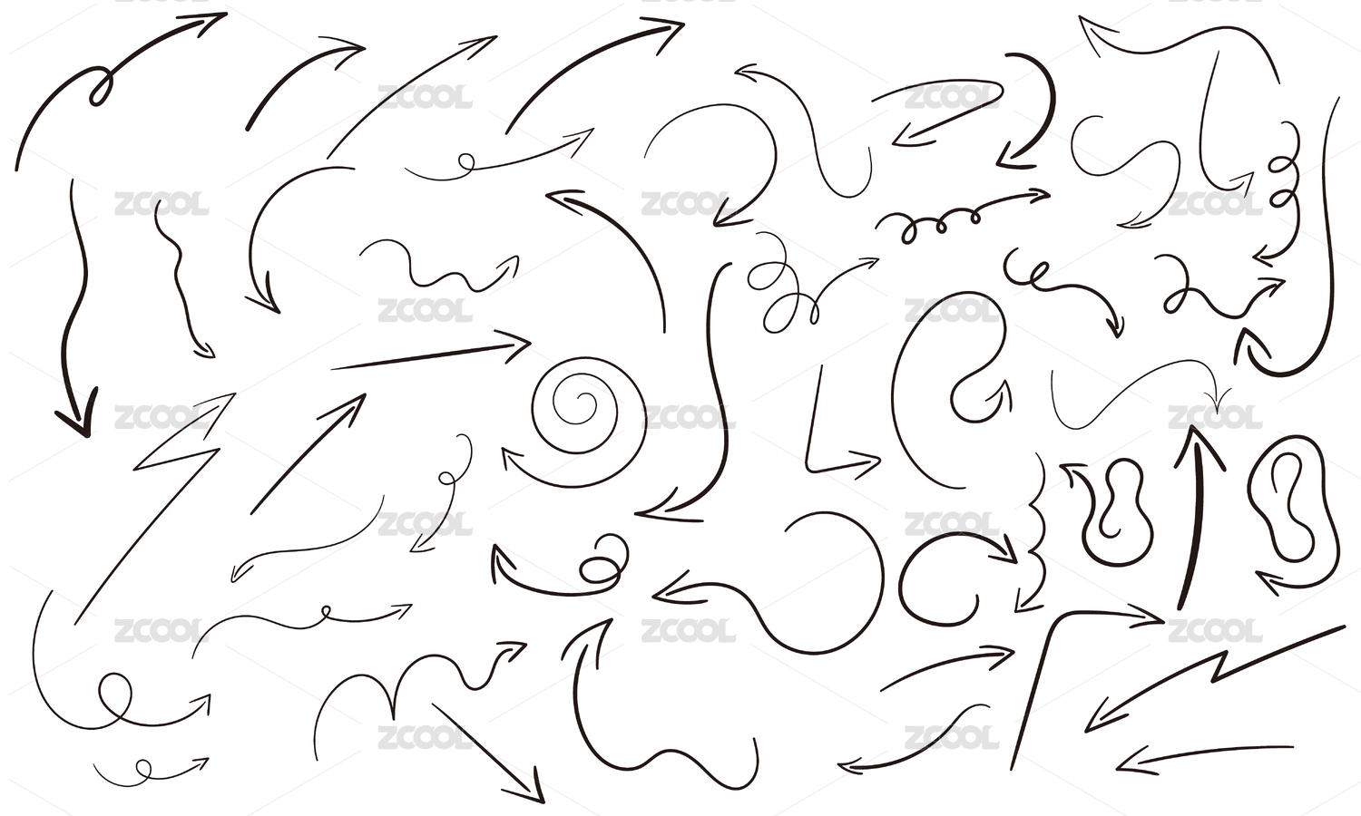 手繪曲線(xiàn)箭頭符號(hào)集合,黑白箭頭圖標(biāo)