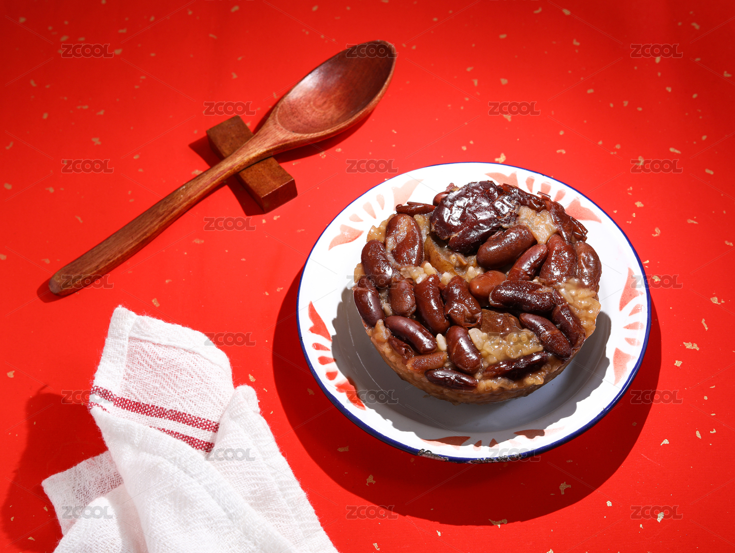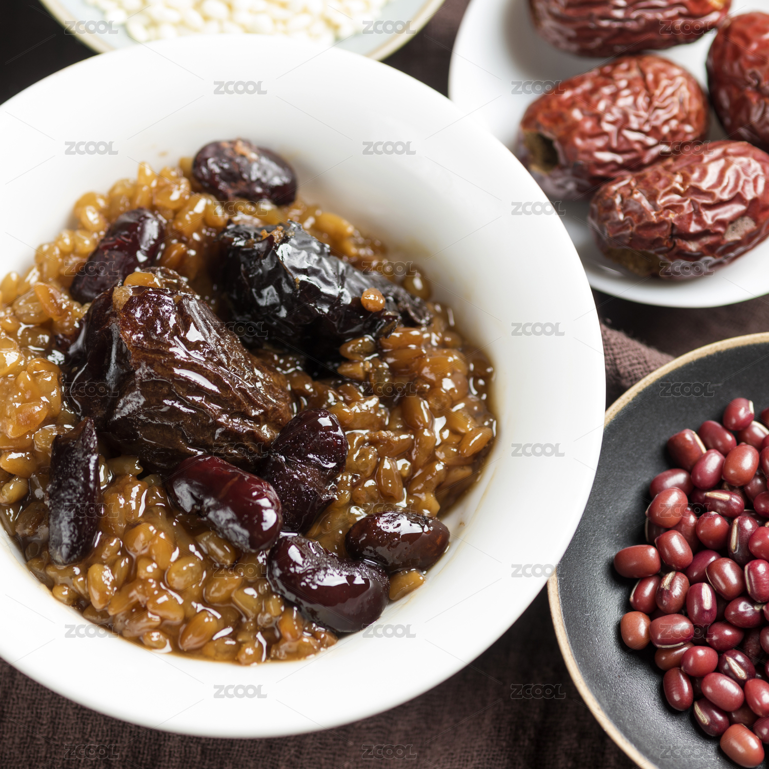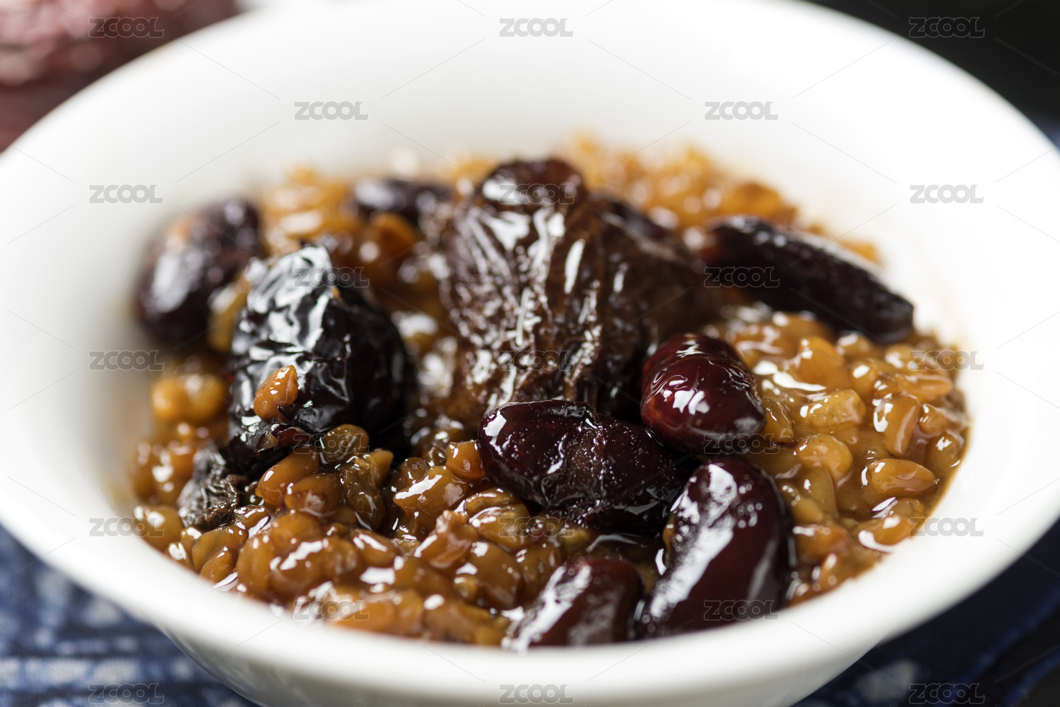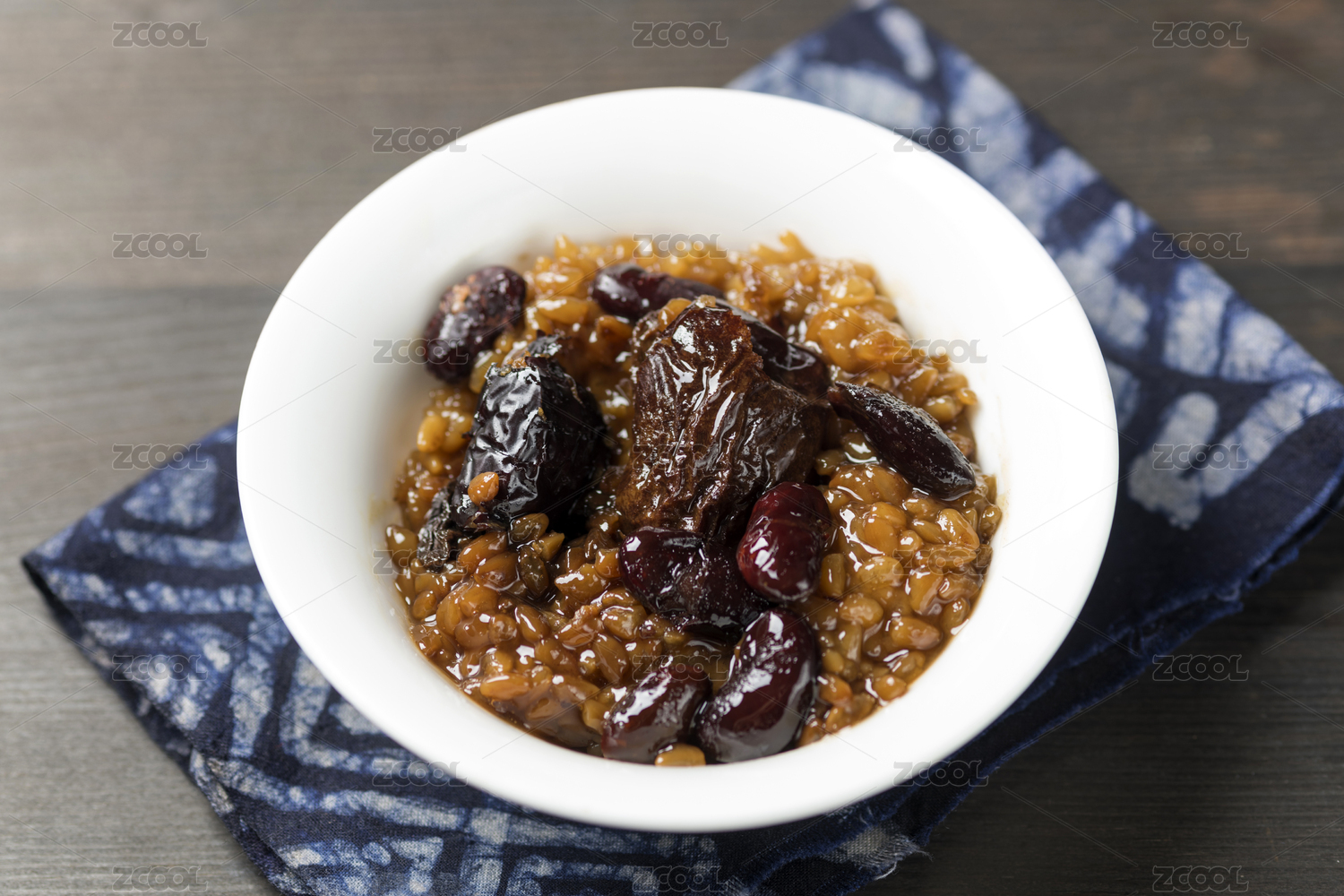 暗色木紋桌面上放著一碗紅豆棗泥甄糕