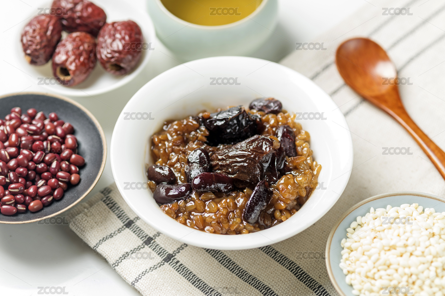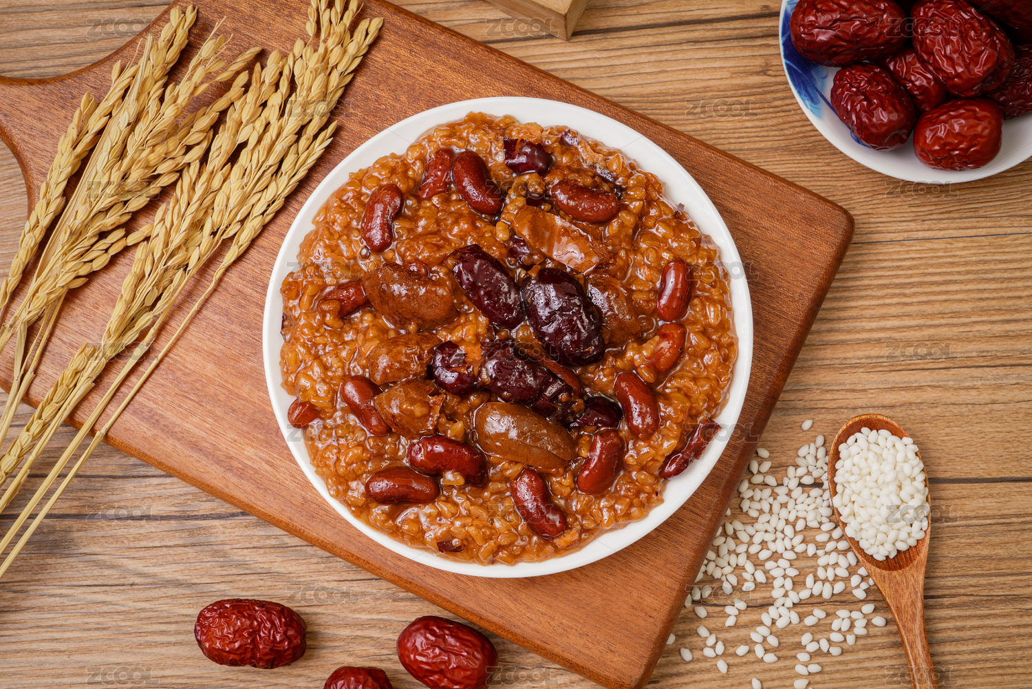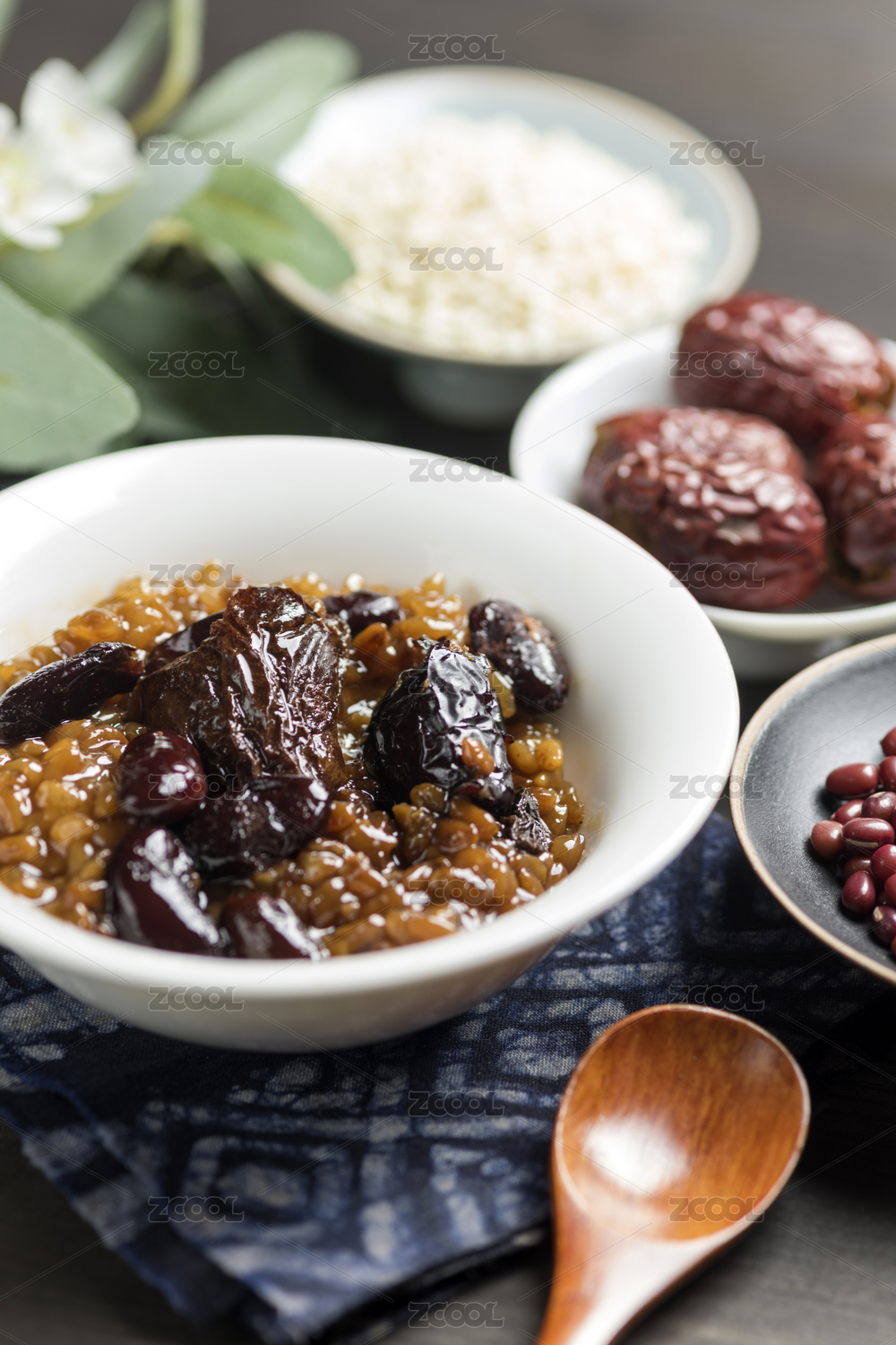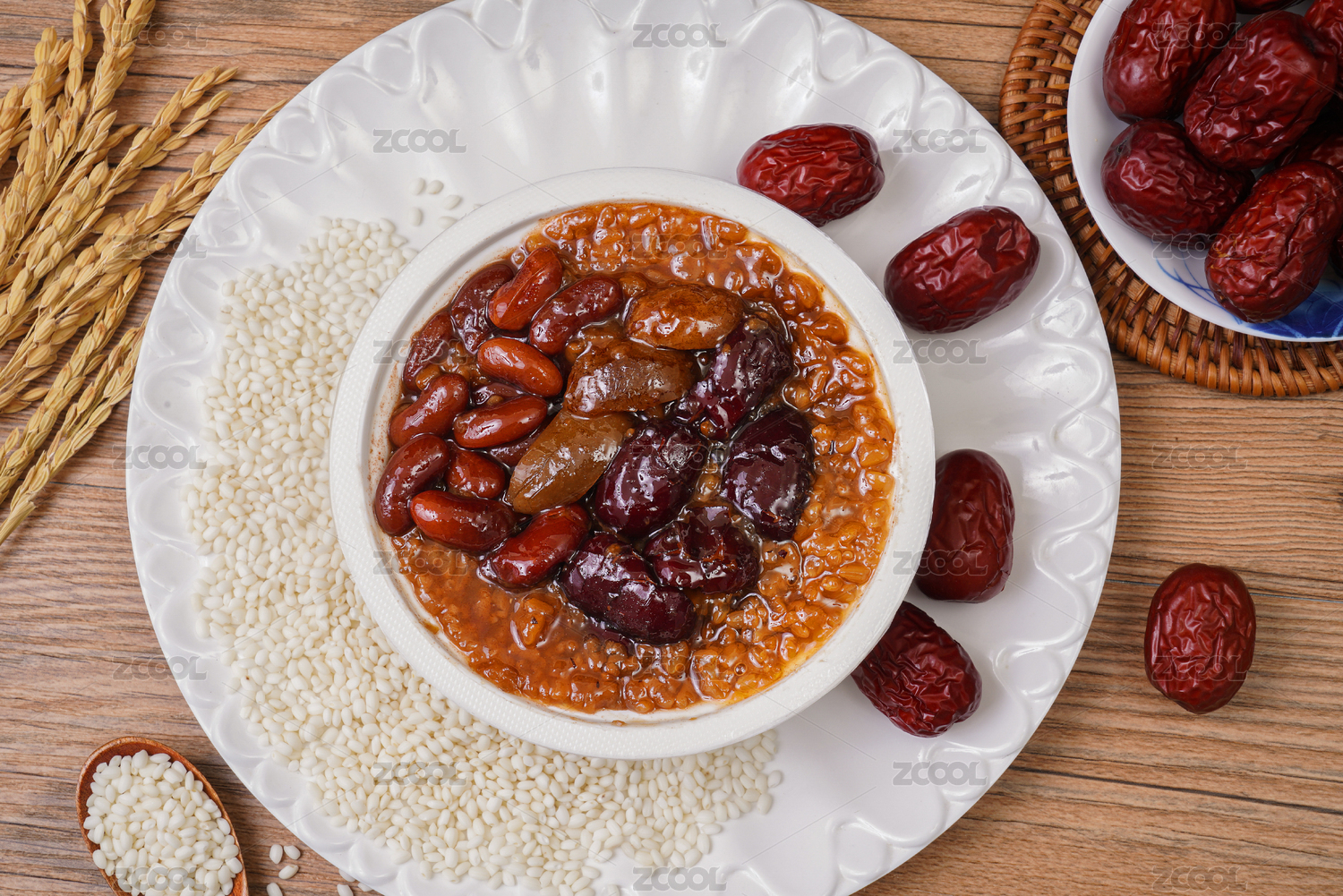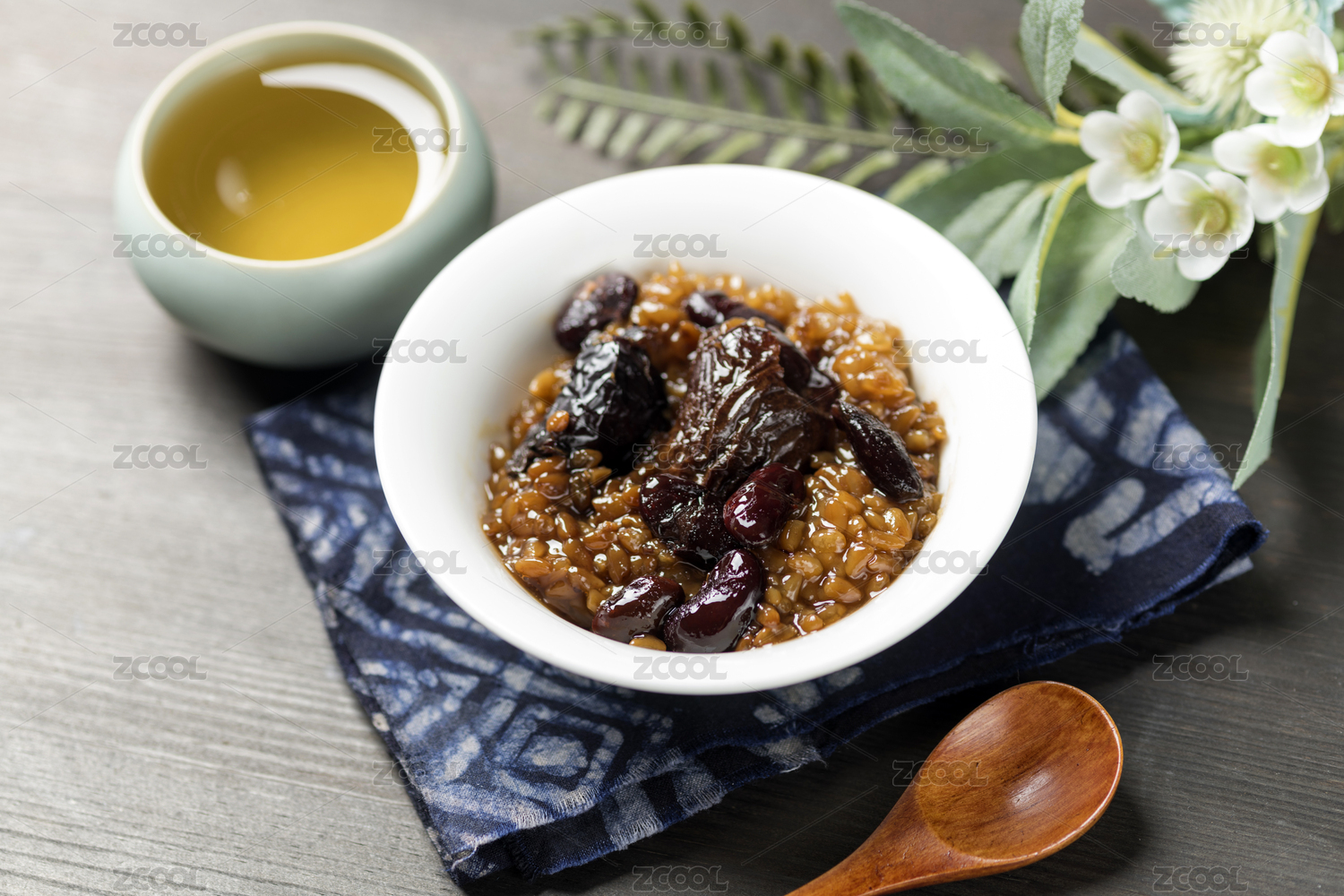暗色木紋桌面上放著一碗紅豆棗泥甄糕