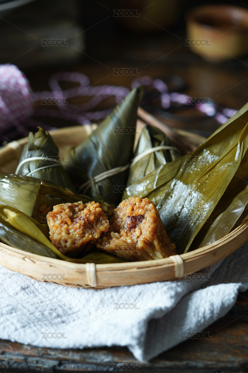 桌上籃子里一只剝?nèi)ヴ杖~掰開的肉粽