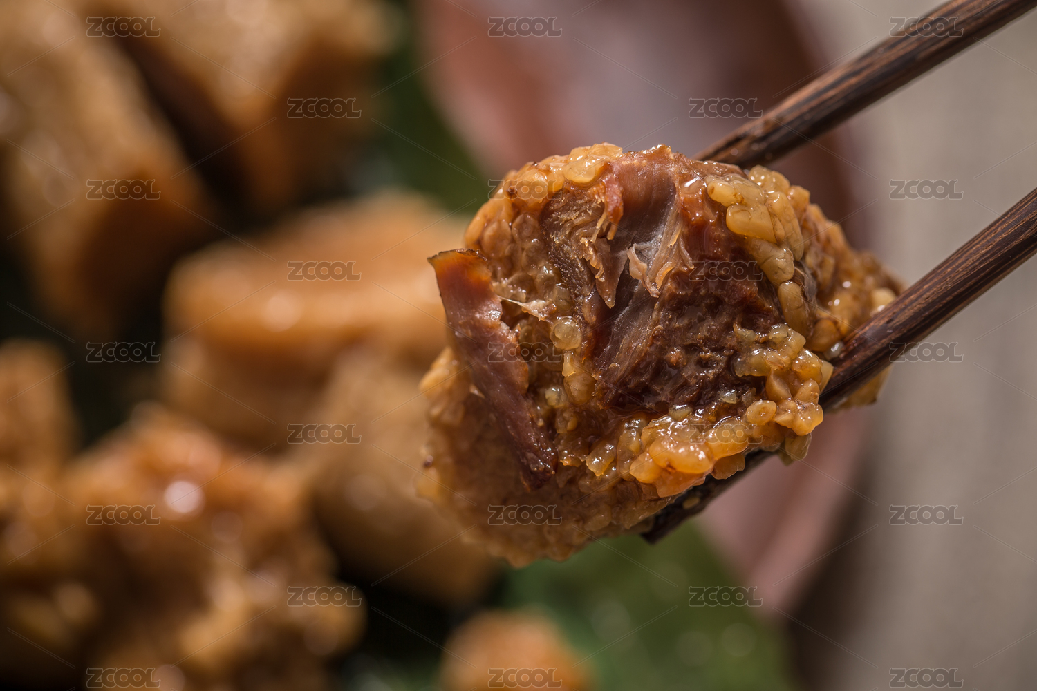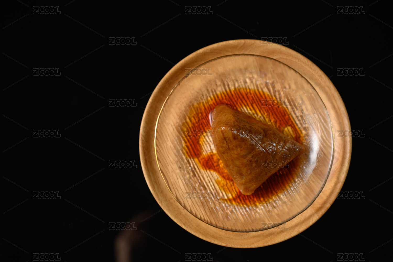 中式復(fù)古場(chǎng)景中剝開放在木盤中的三角肉粽