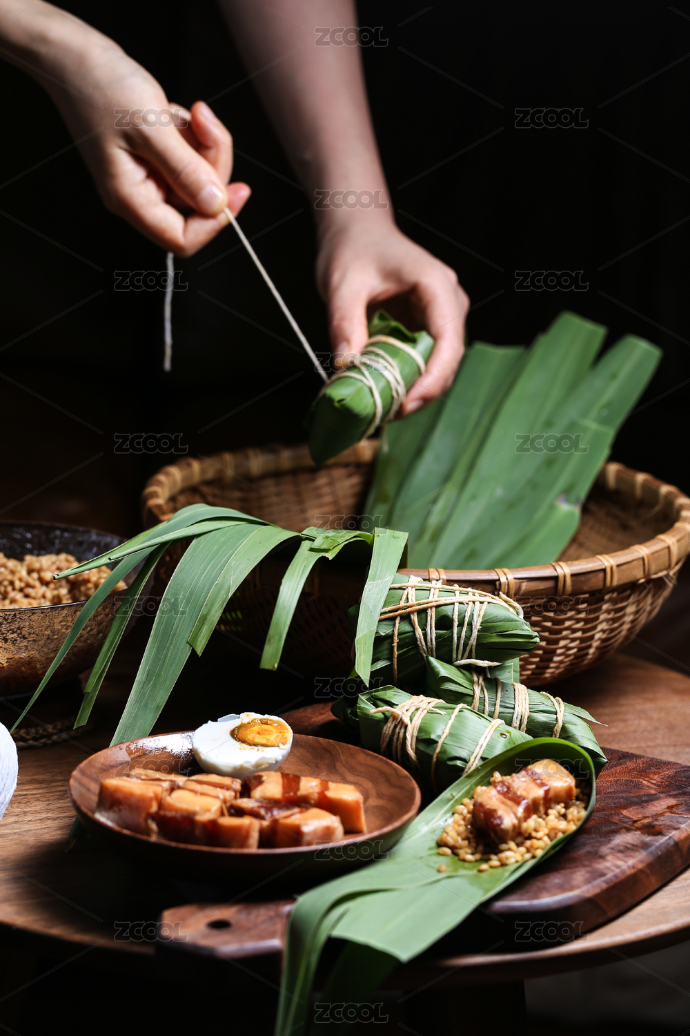 中式復(fù)古場(chǎng)景中木桌上剝開的肉粽和各種食材