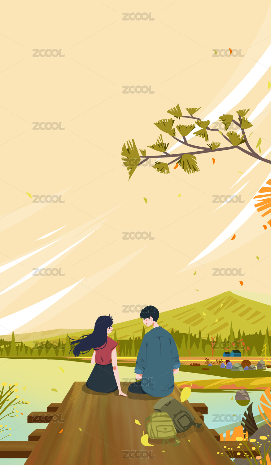 秋季郊外旅游的情侶插畫 兩個坐在橋邊聊天的人