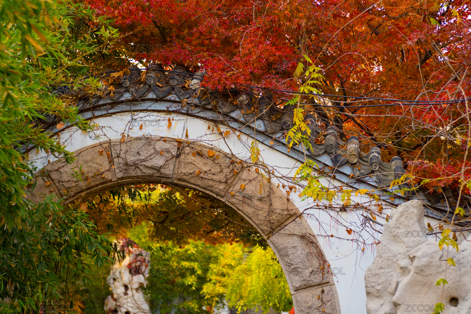 秋季中國山東省煙臺市南山公園中拱門一角與茂盛的楓葉