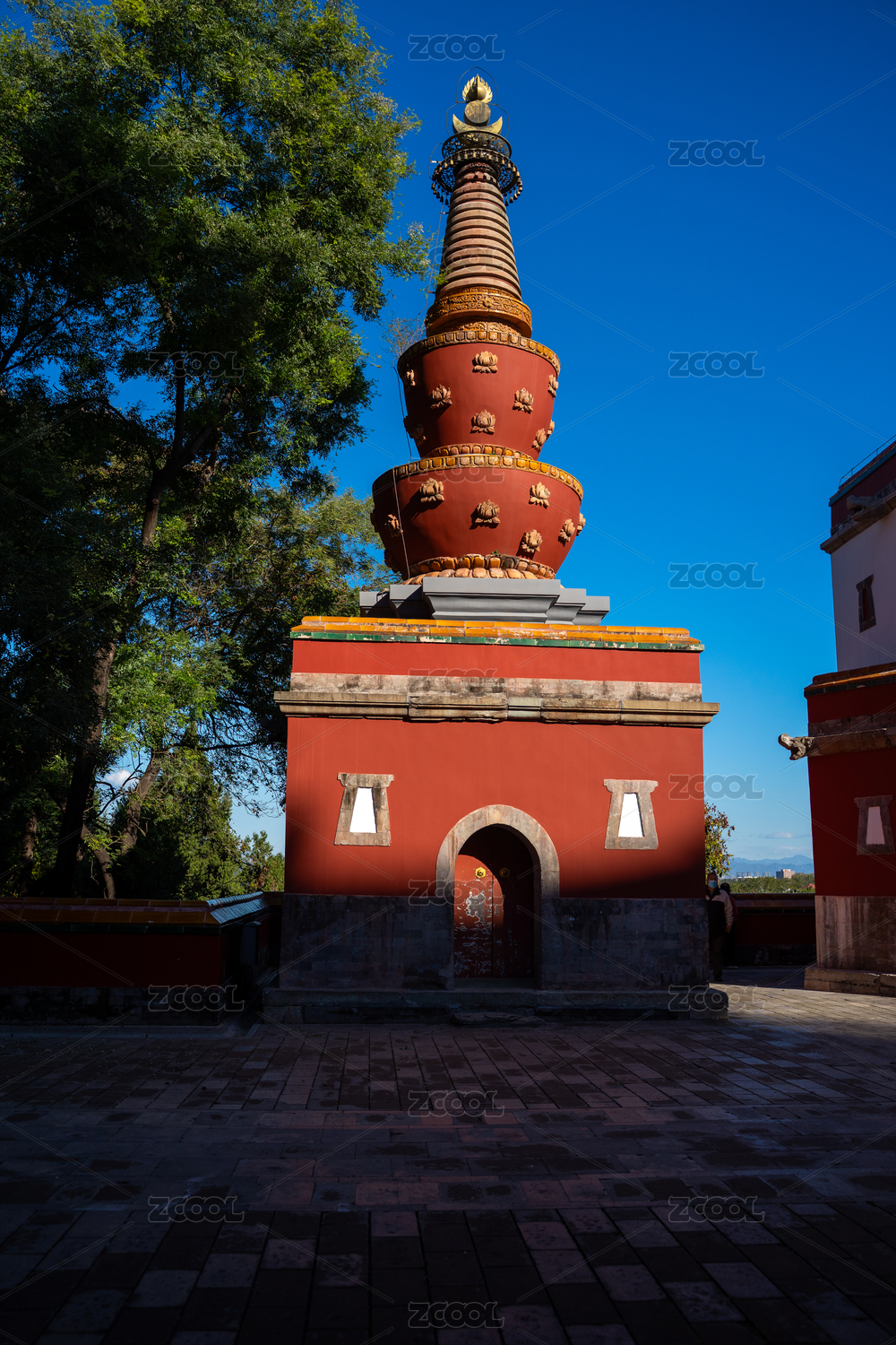 北京頤和園古塔與紅墻建筑的靜謐景象