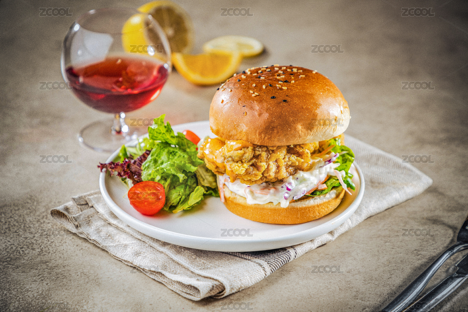 水泥紋路桌面上有一份雞肉漢堡