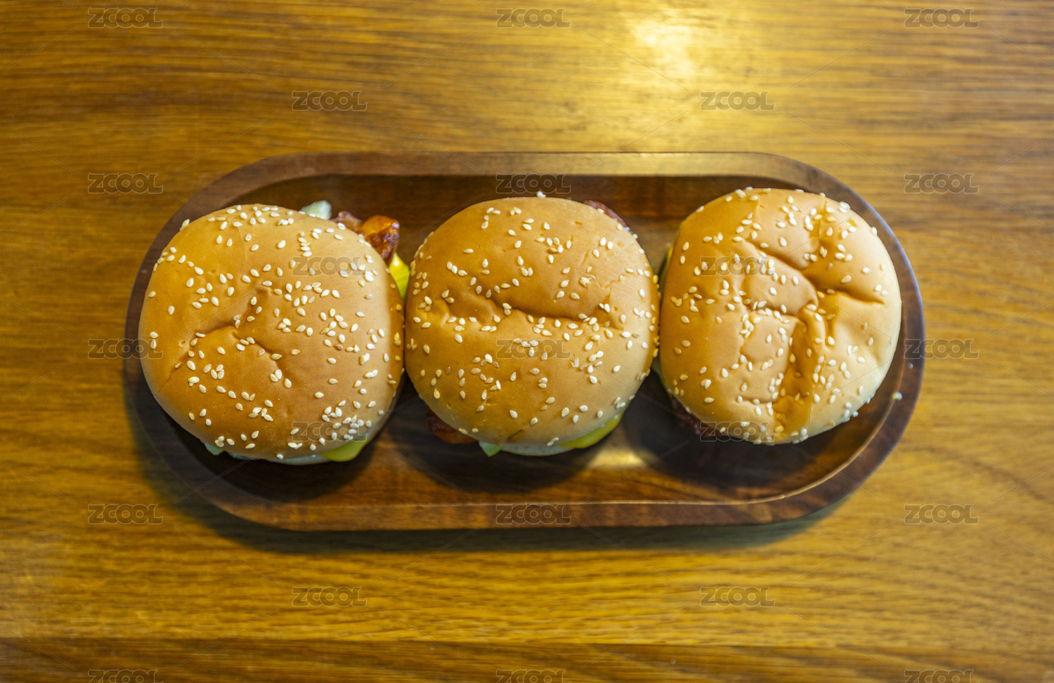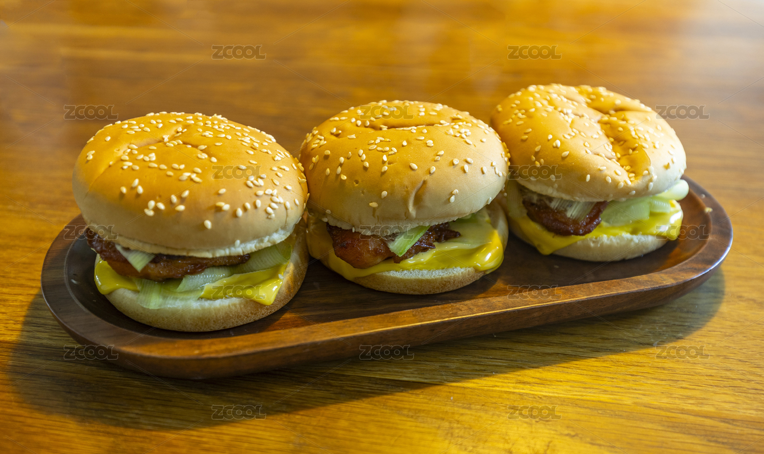 放在桌上的三個(gè)雞肉漢堡