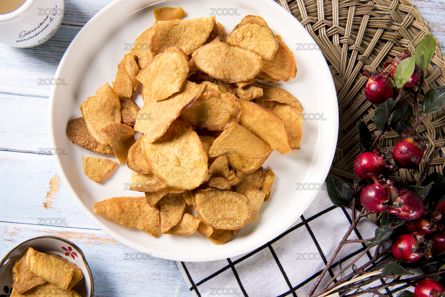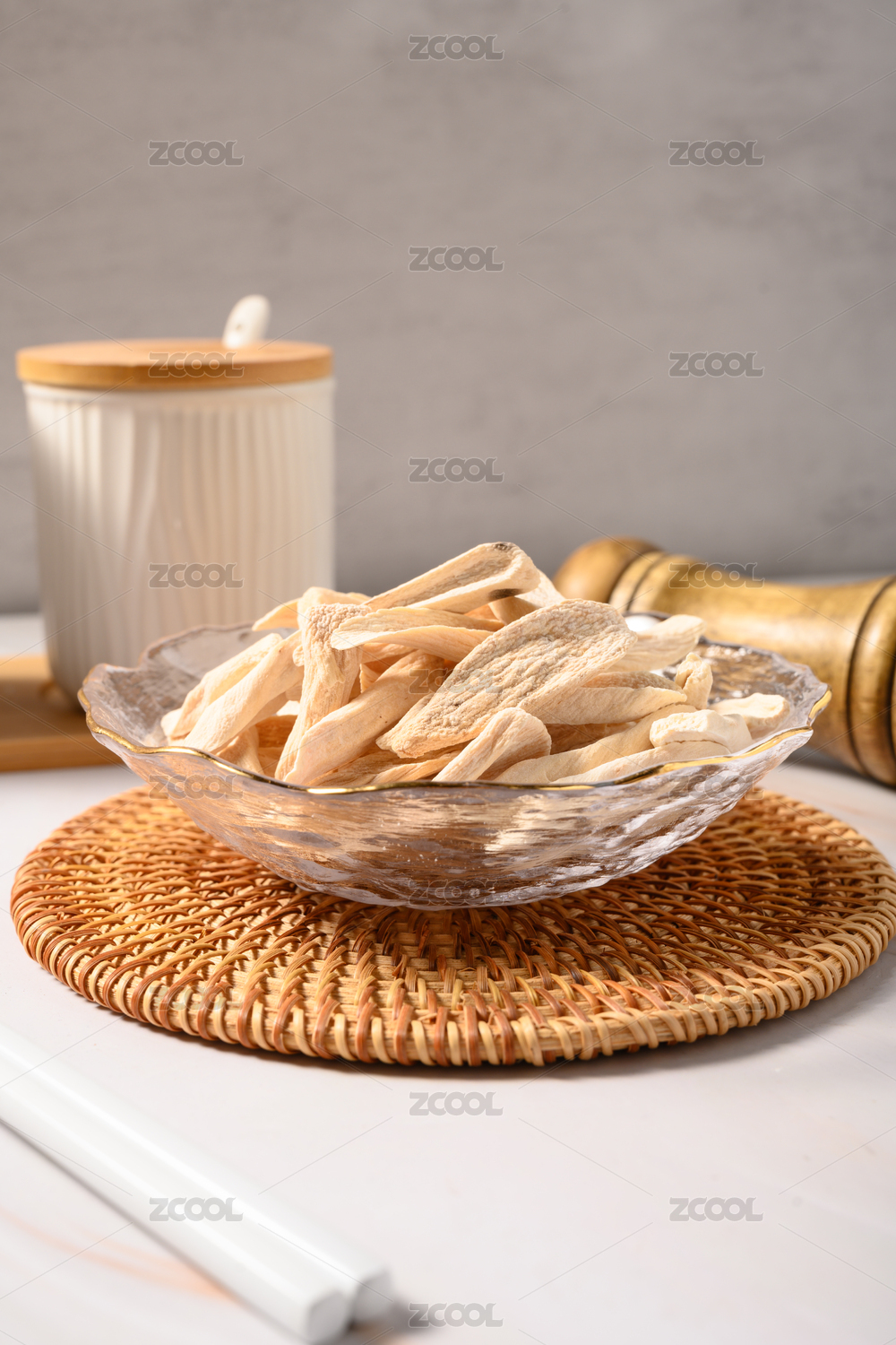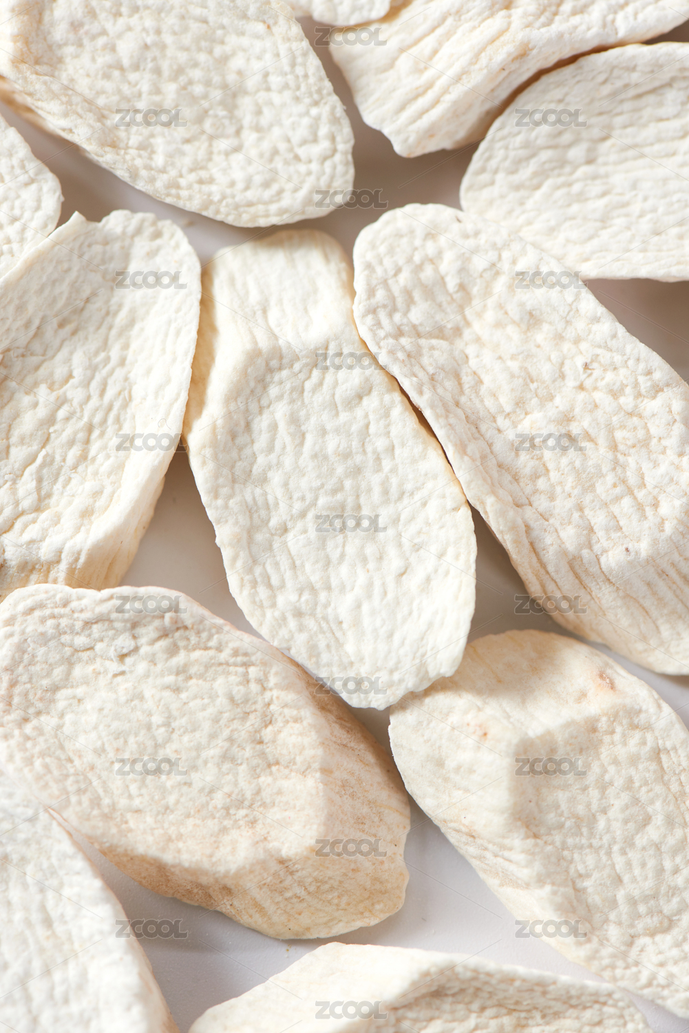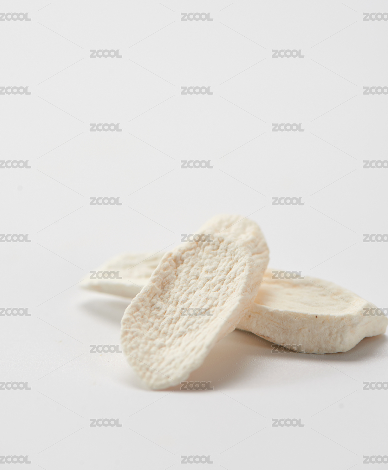 白色背景上擺放的切片山藥干