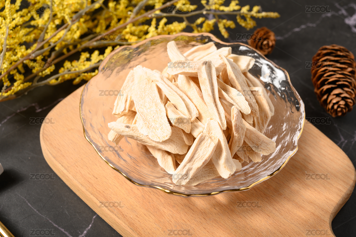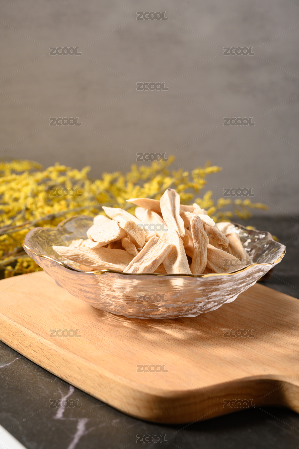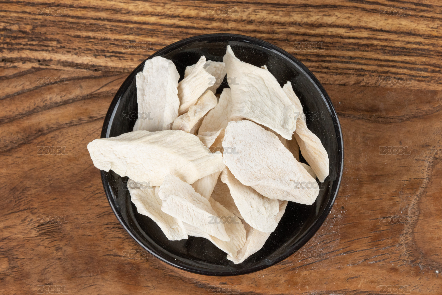 木紋背景上擺放的切片鐵棍山藥干