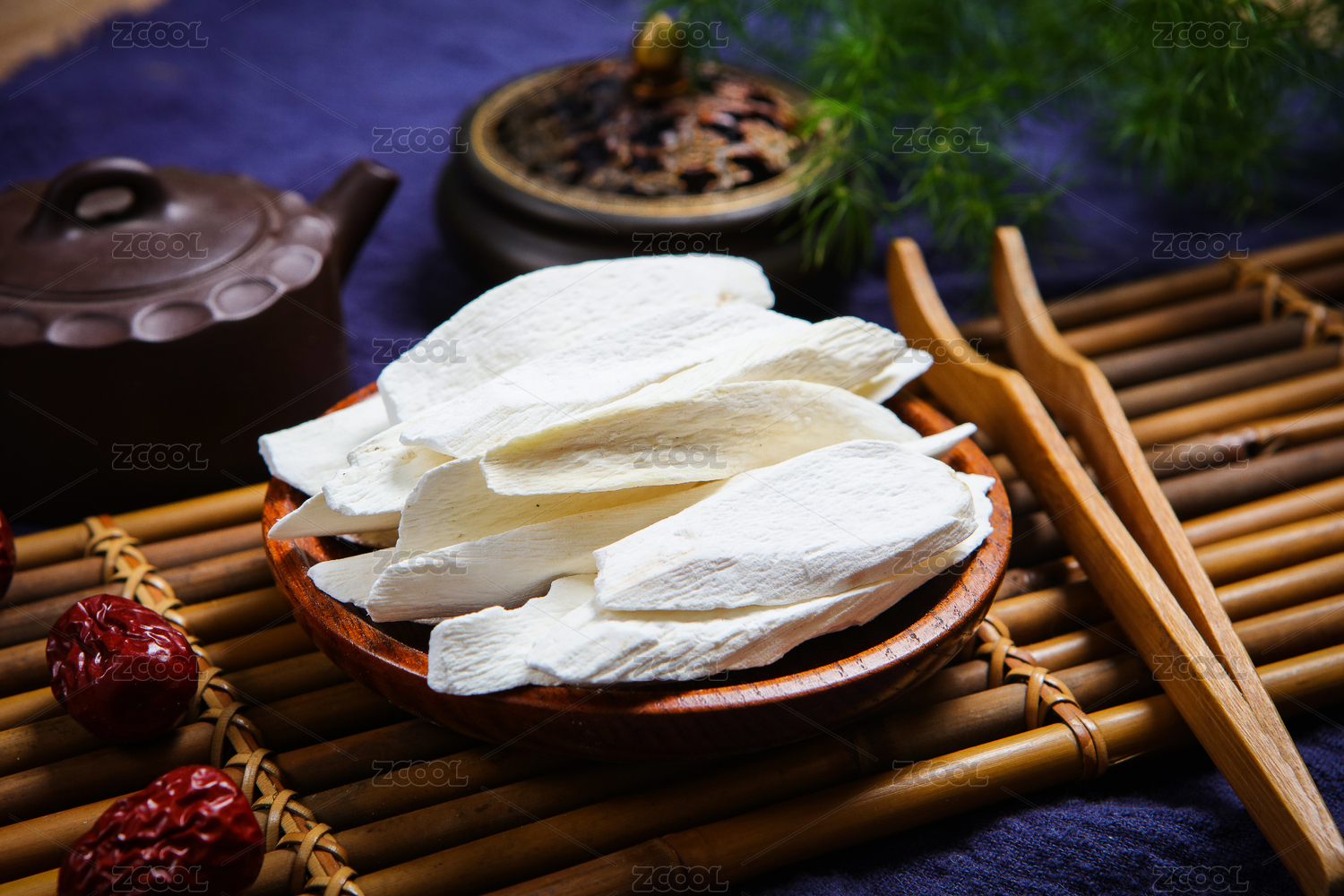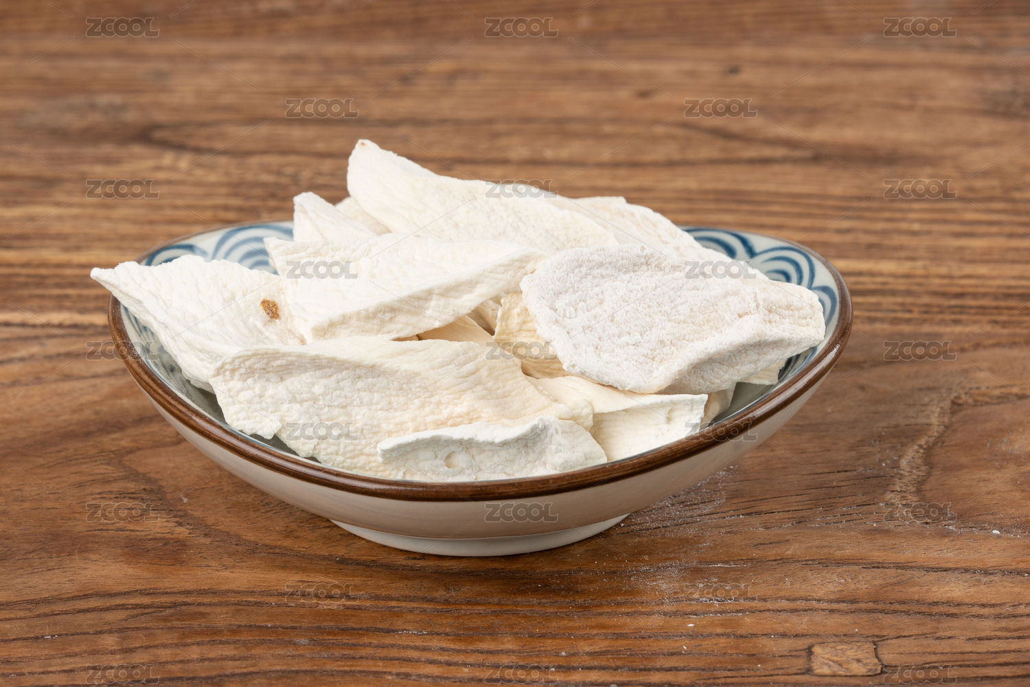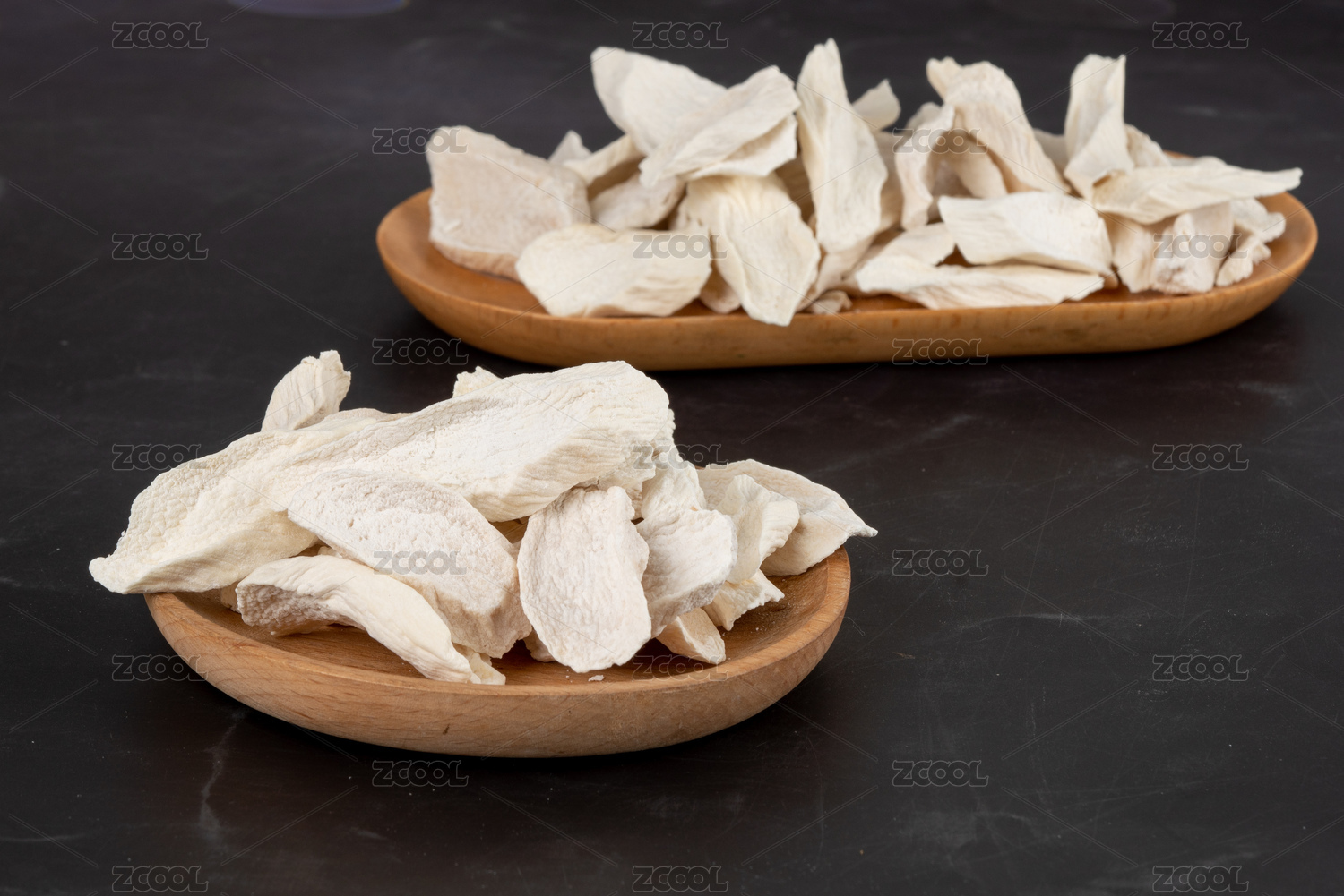 木紋背景上擺放的切片鐵棍山藥干