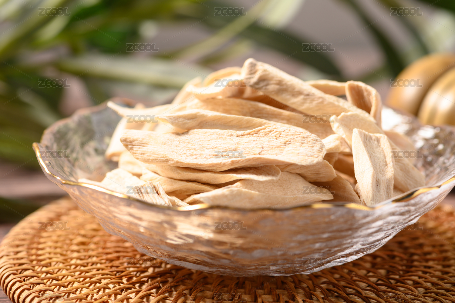 桌面上的玻璃盤子里的美味可口的山藥干