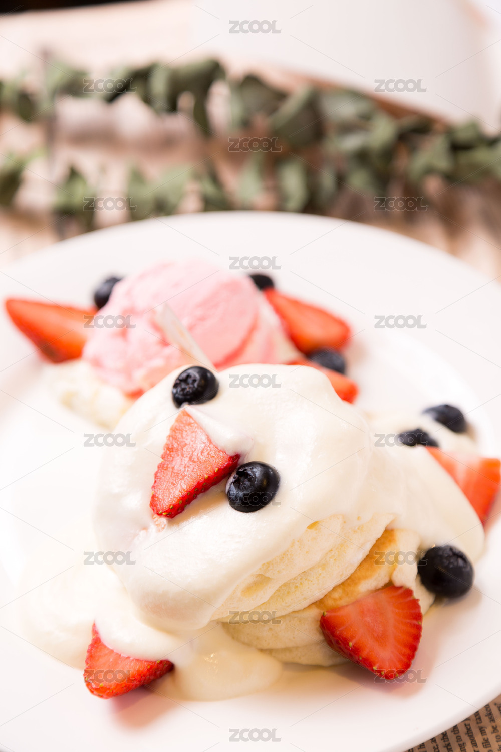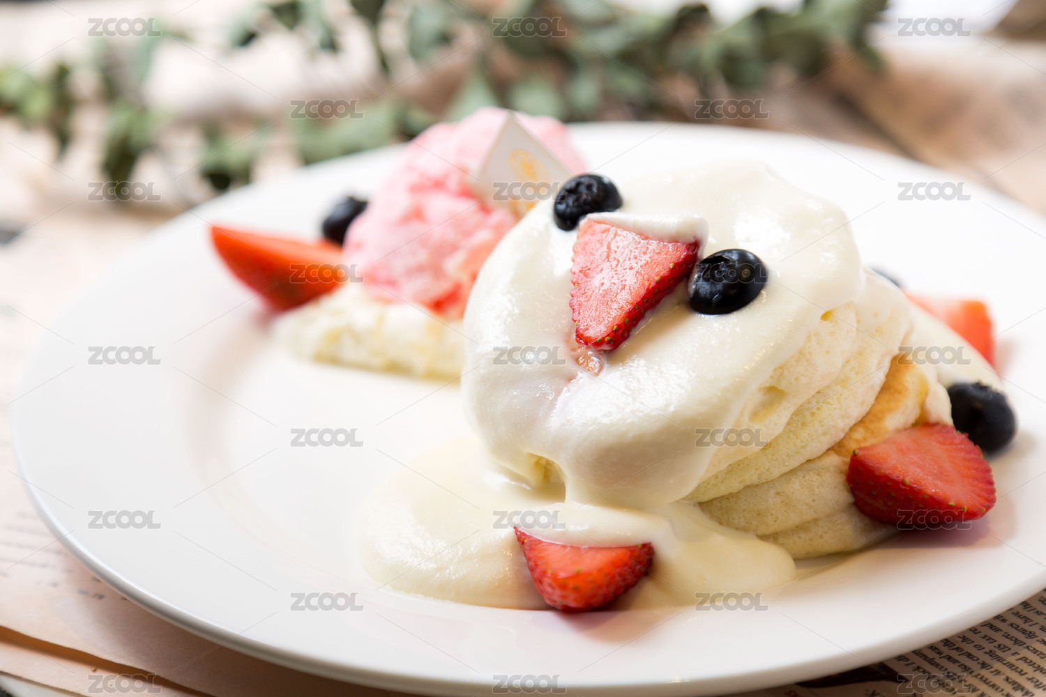 原木板上的三層舒芙蕾松餅,中間有奶油,上面有草莓和藍(lán)莓