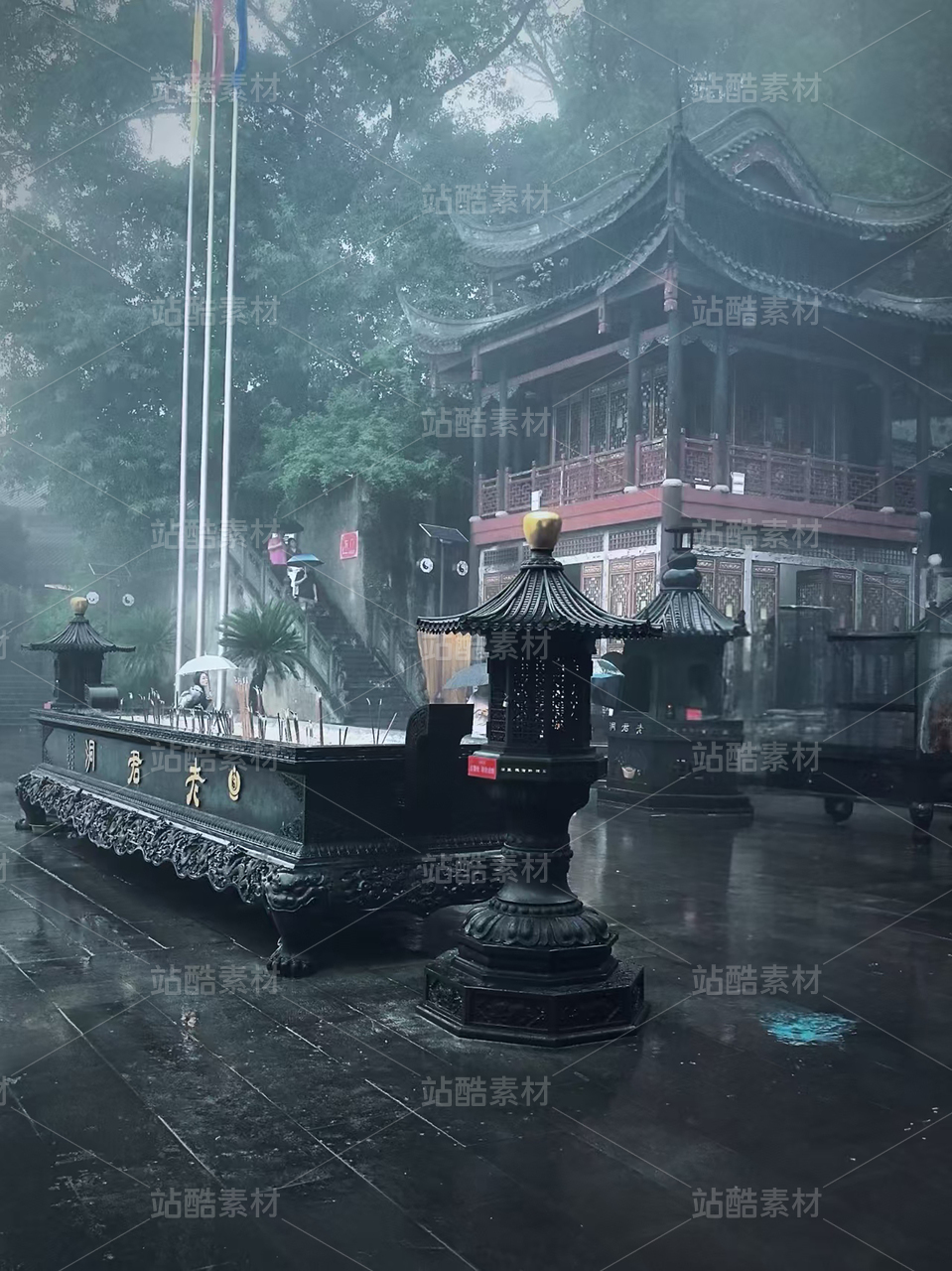 煙雨朦朧中的古寺庭院