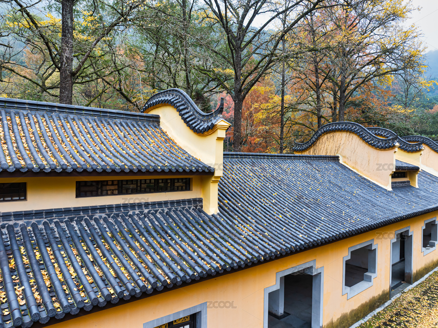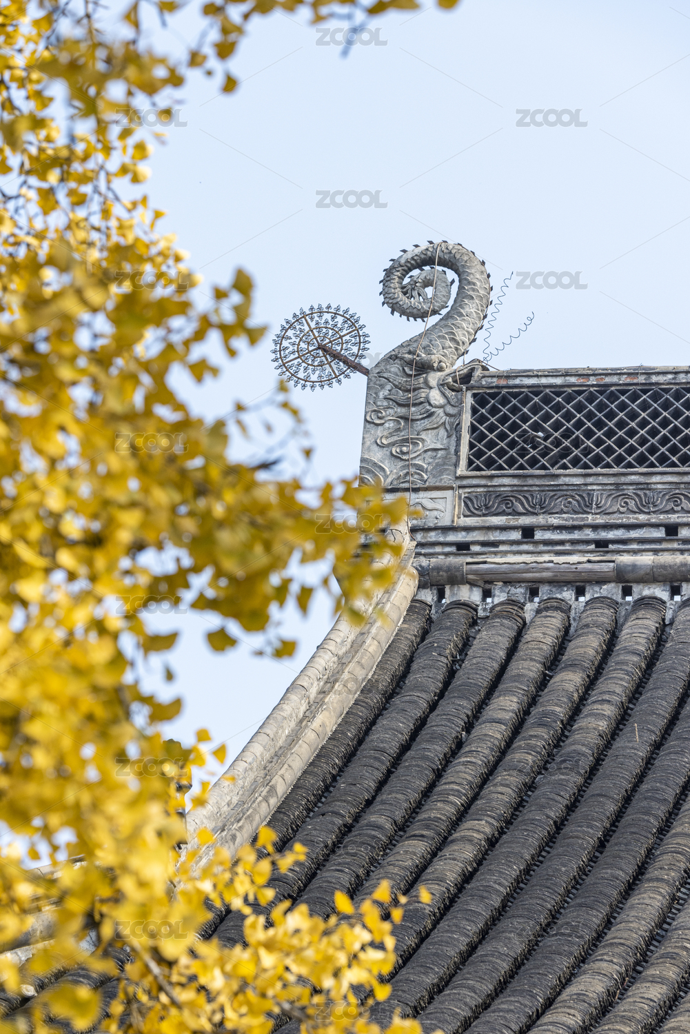 五泄風(fēng)景區(qū)深秋古寺屋檐銀杏落葉禪意風(fēng)光