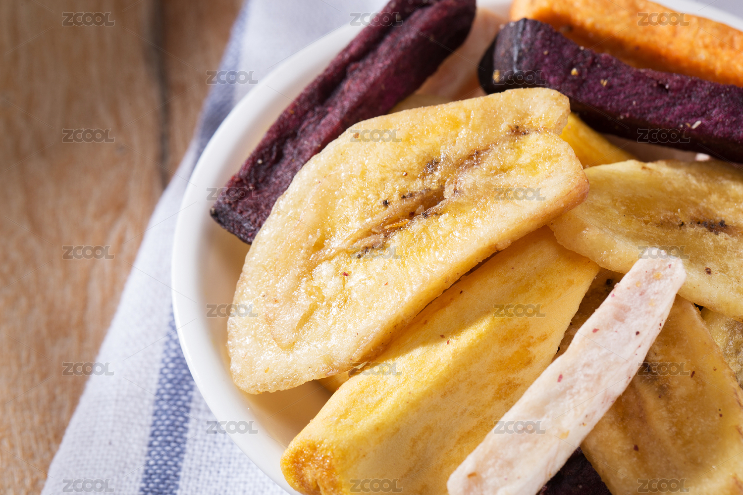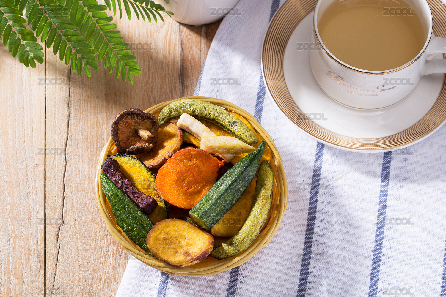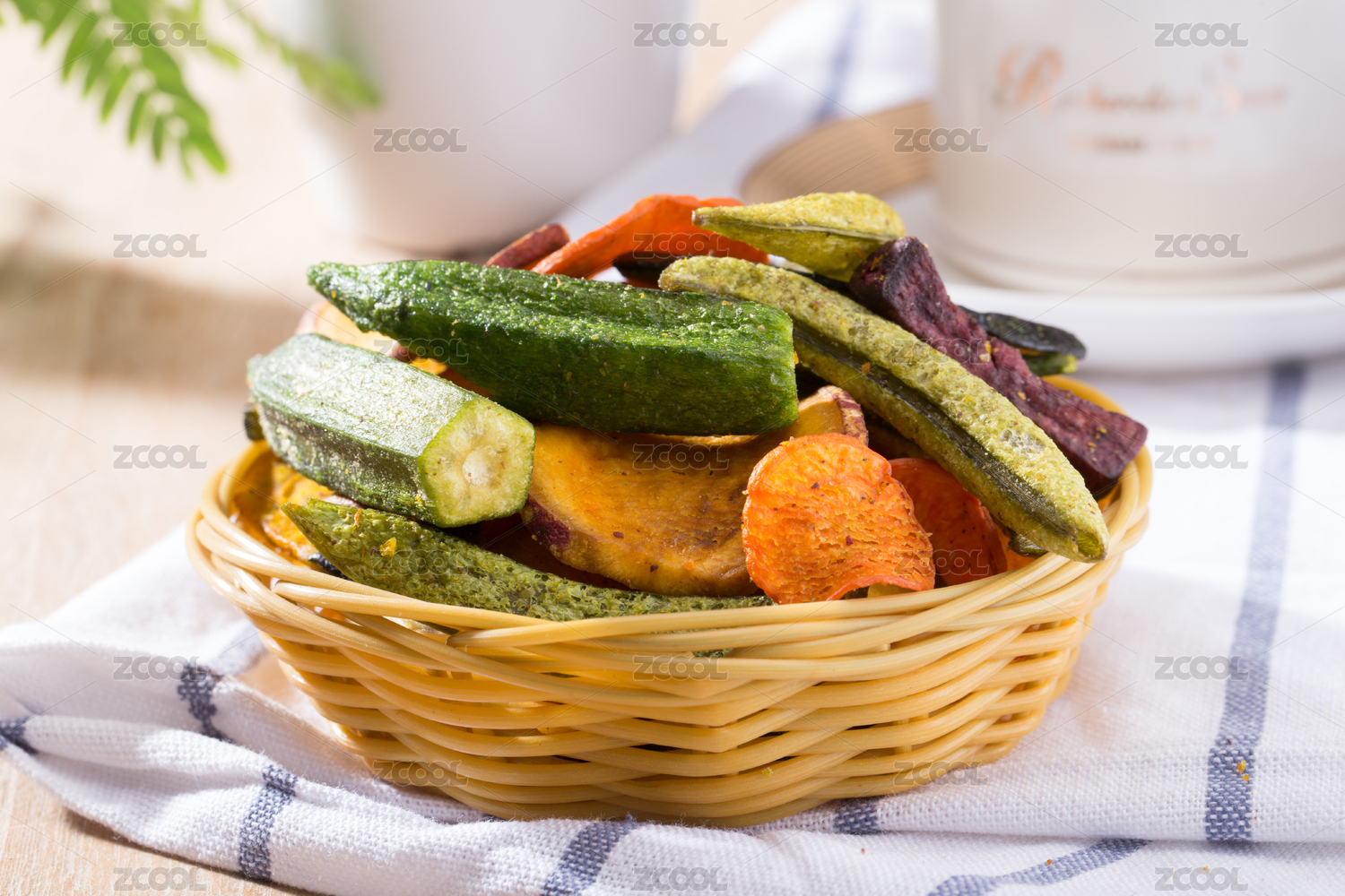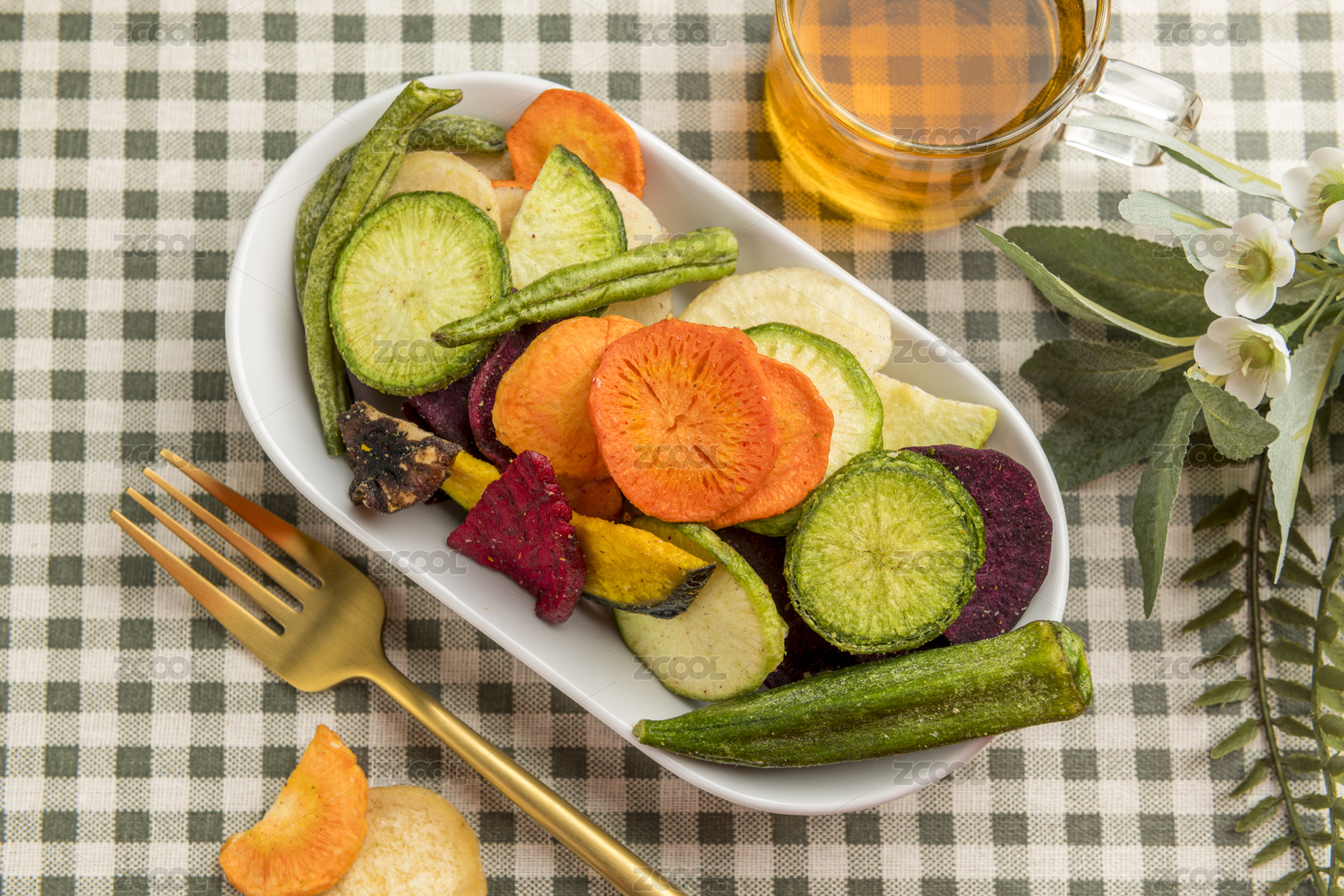 一盤(pán)蔬菜干蔬菜脆擺放在桌面上特寫(xiě)