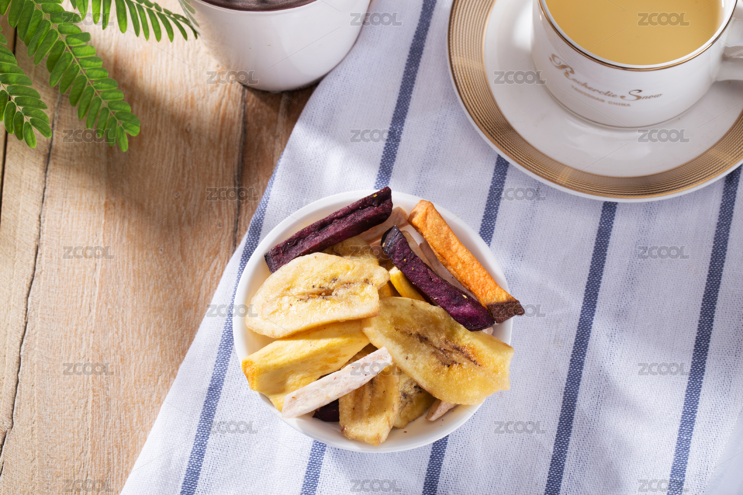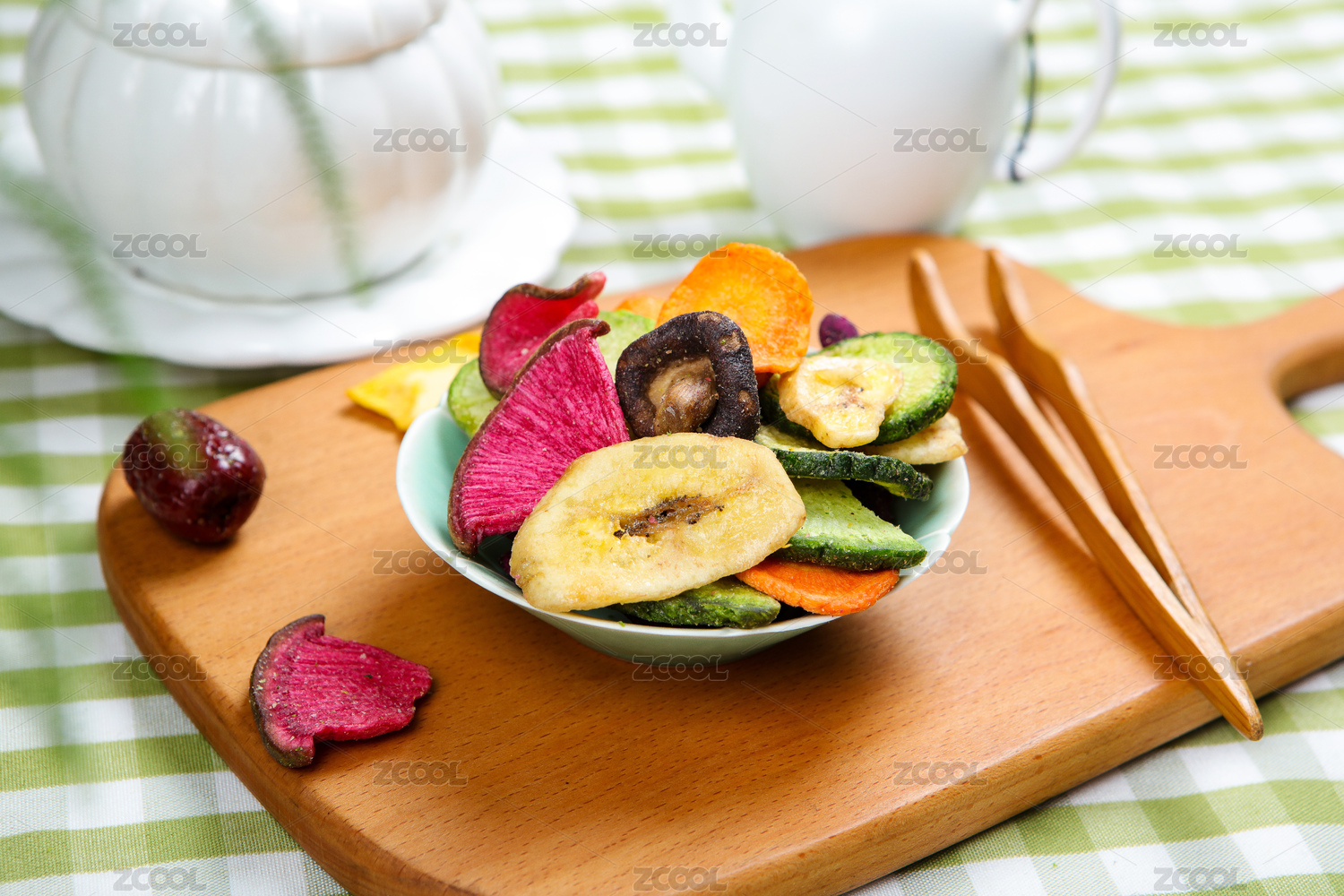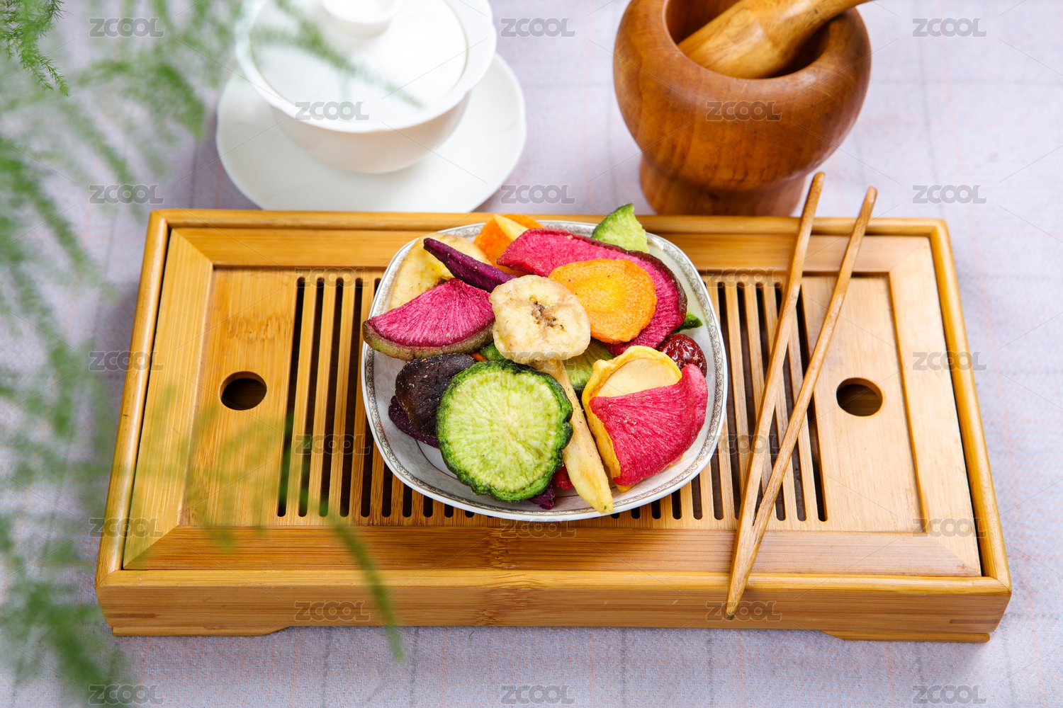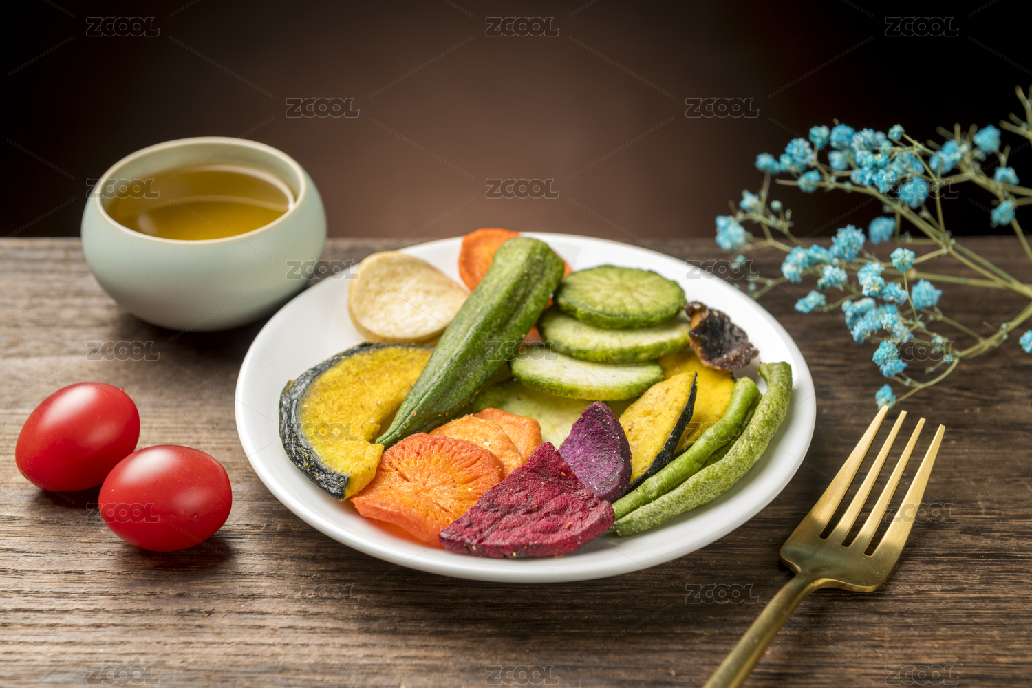 一盤(pán)蔬菜干蔬菜脆擺放在桌面上特寫(xiě)
