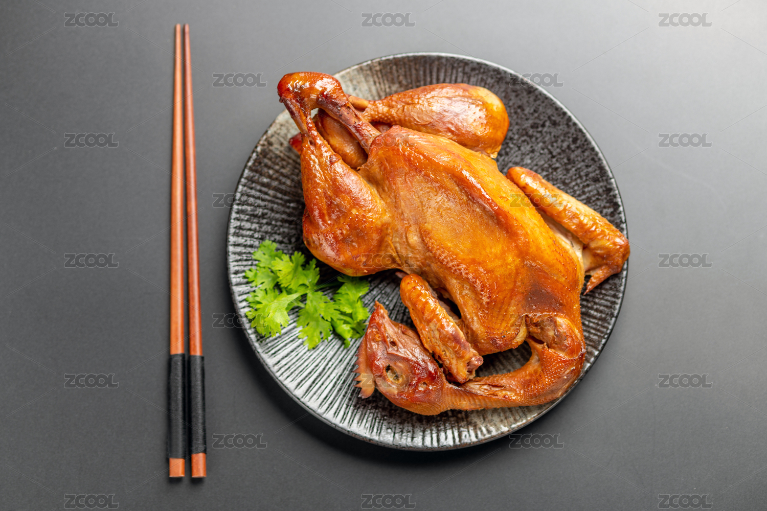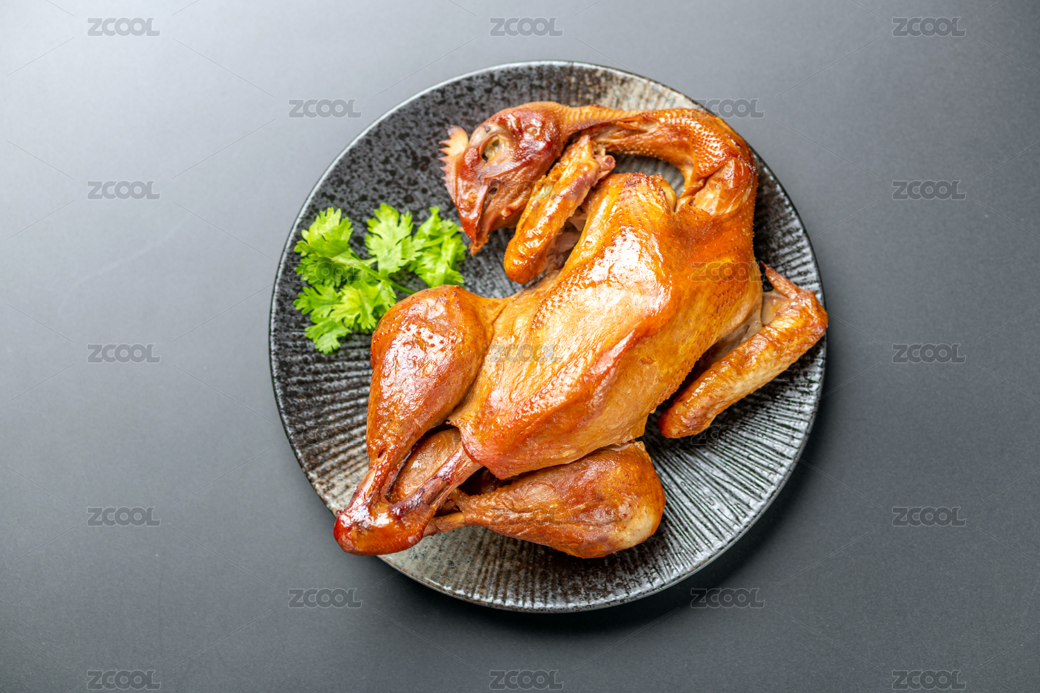 一盤整只燒雞擺放在黑色背景上