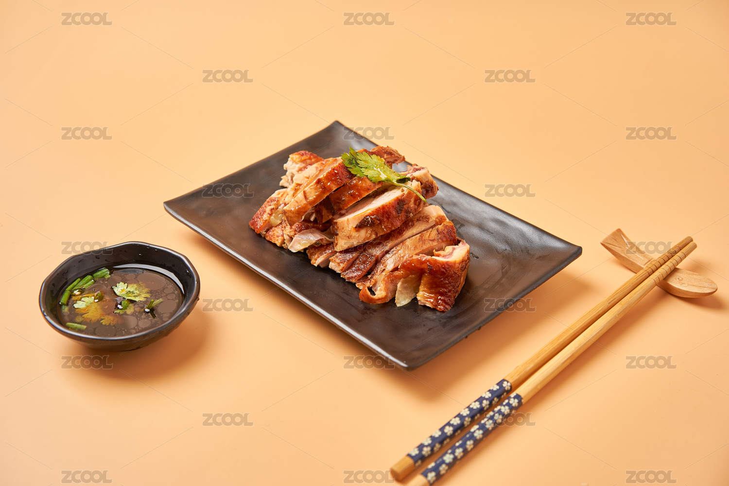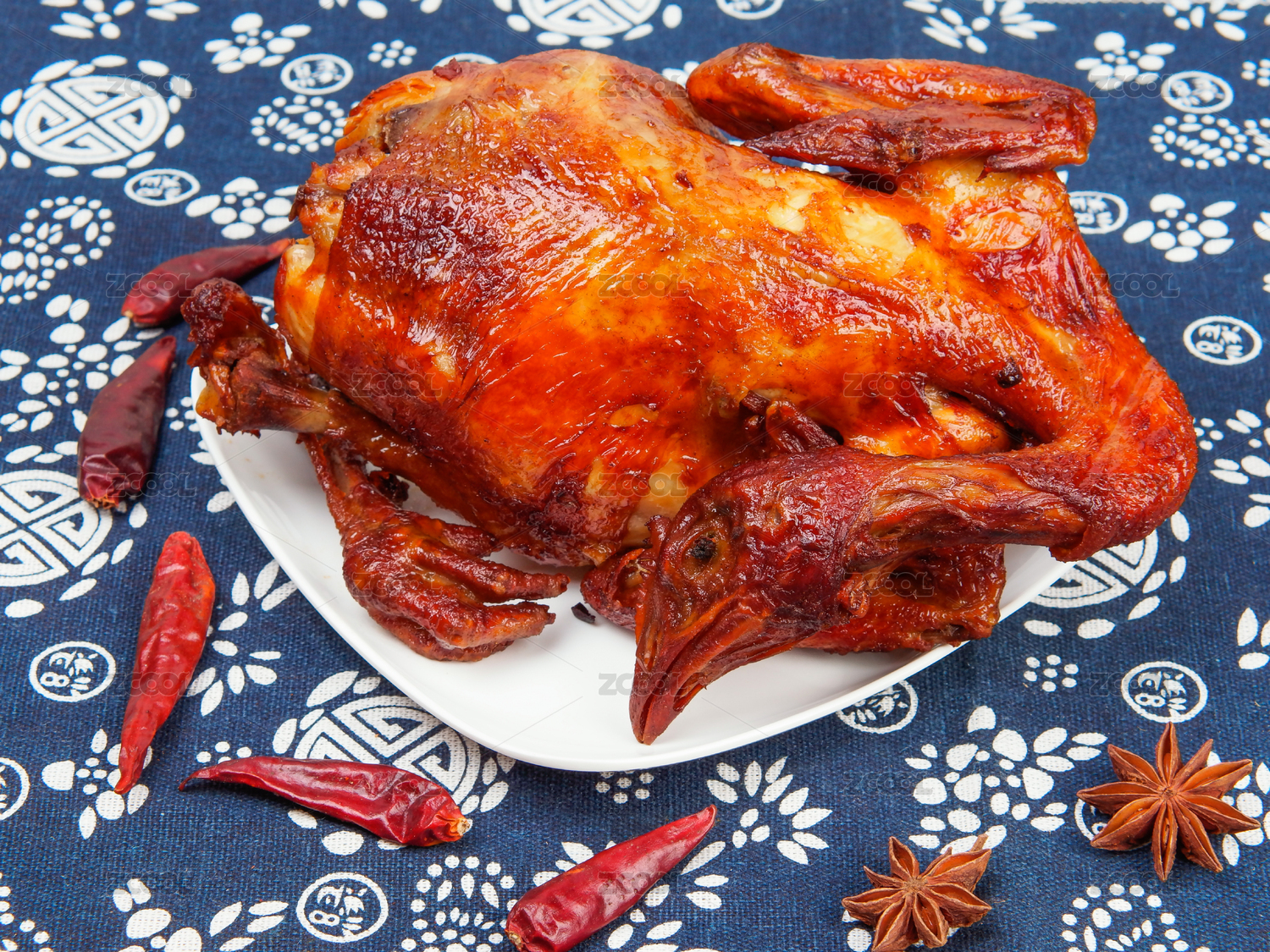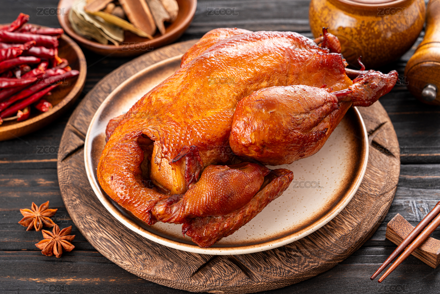 放在淺色背景上的鹵味燒雞和調(diào)料