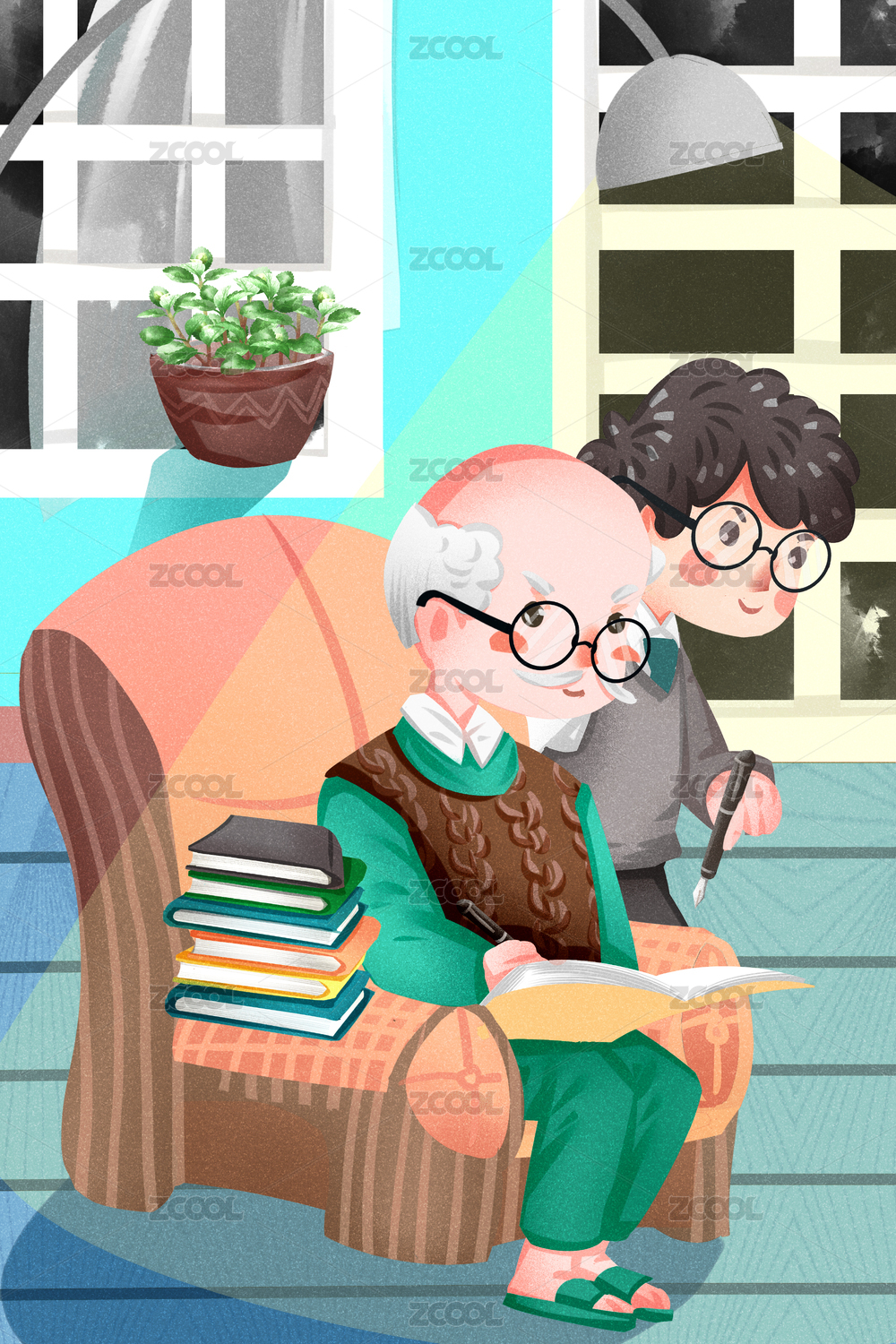 住宅客廳中孫子指導(dǎo)爺爺坐在沙發(fā)上學(xué)習(xí)讀書識(shí)字插畫