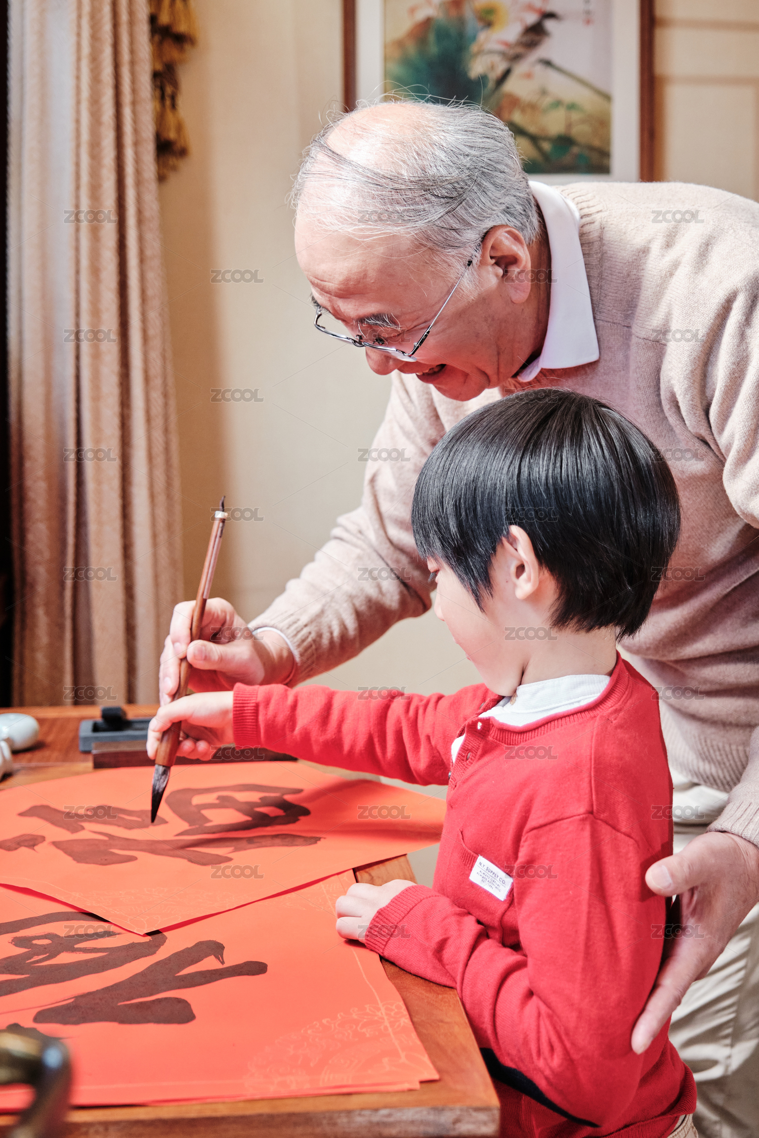 爺爺教孫子寫毛筆字