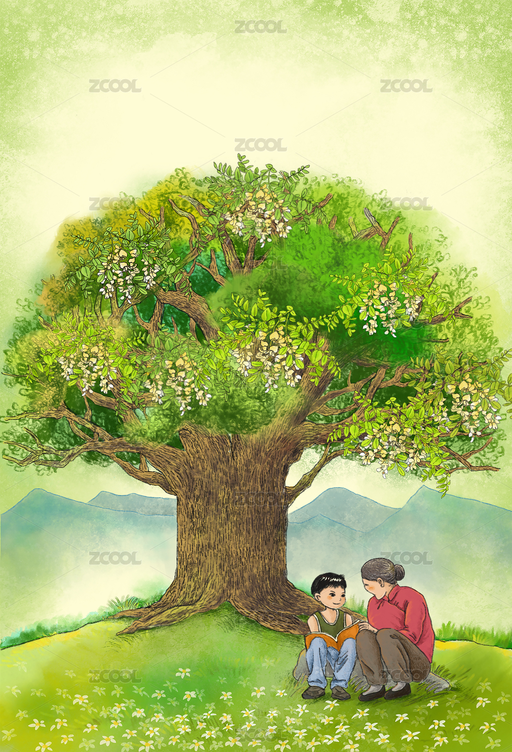 大槐樹下的奶奶與小孫子