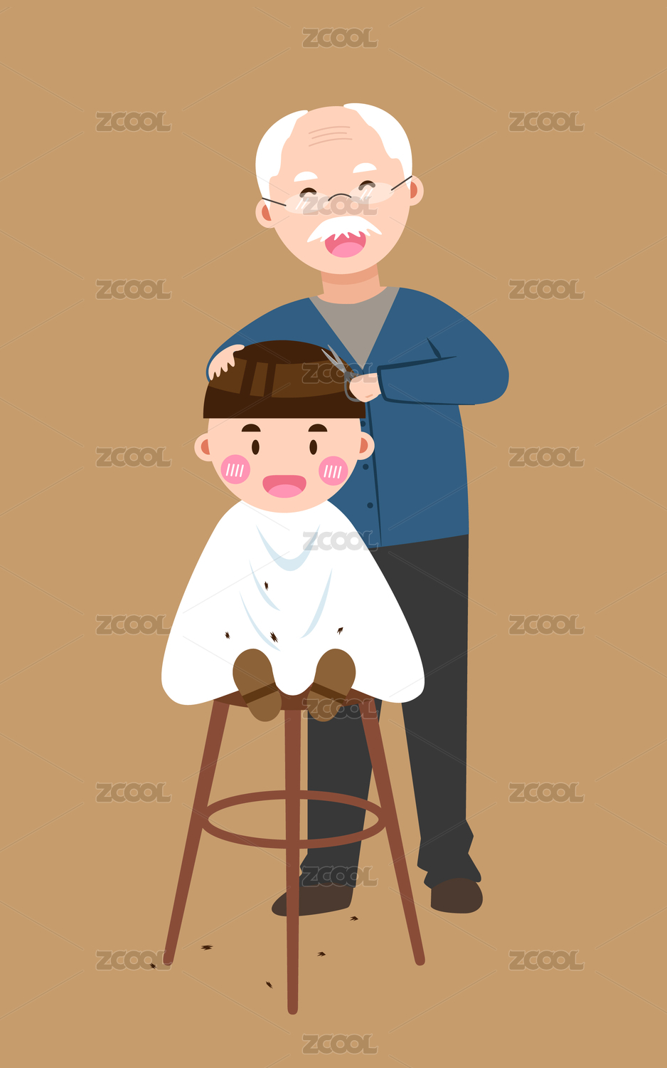 爺爺給孫子理發(fā) 插畫