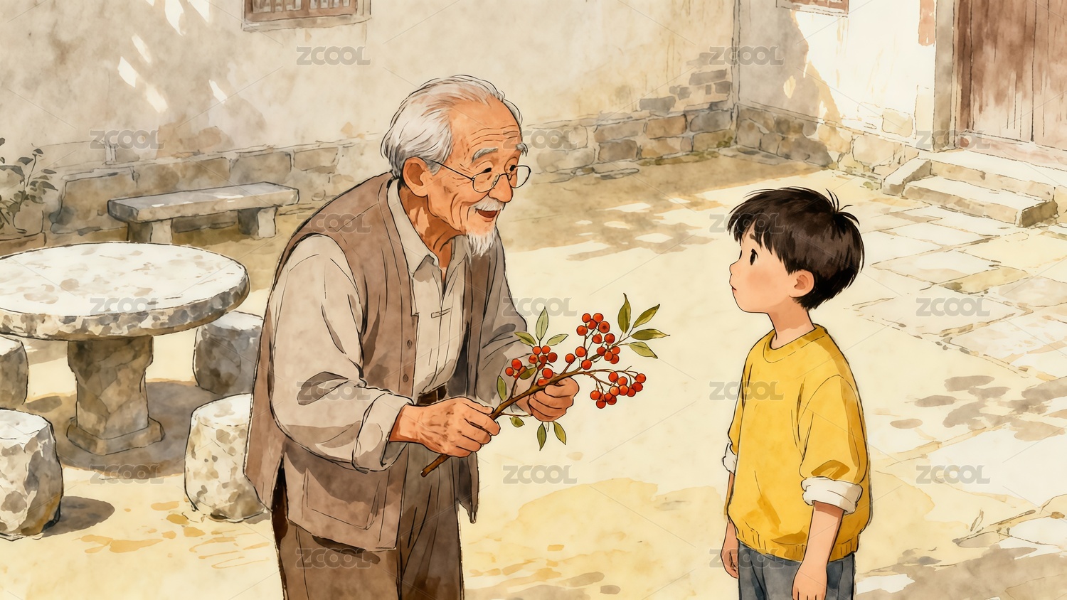 重陽(yáng)節(jié)爺爺教孫子認(rèn)識(shí)茱萸手繪風(fēng)格插畫
