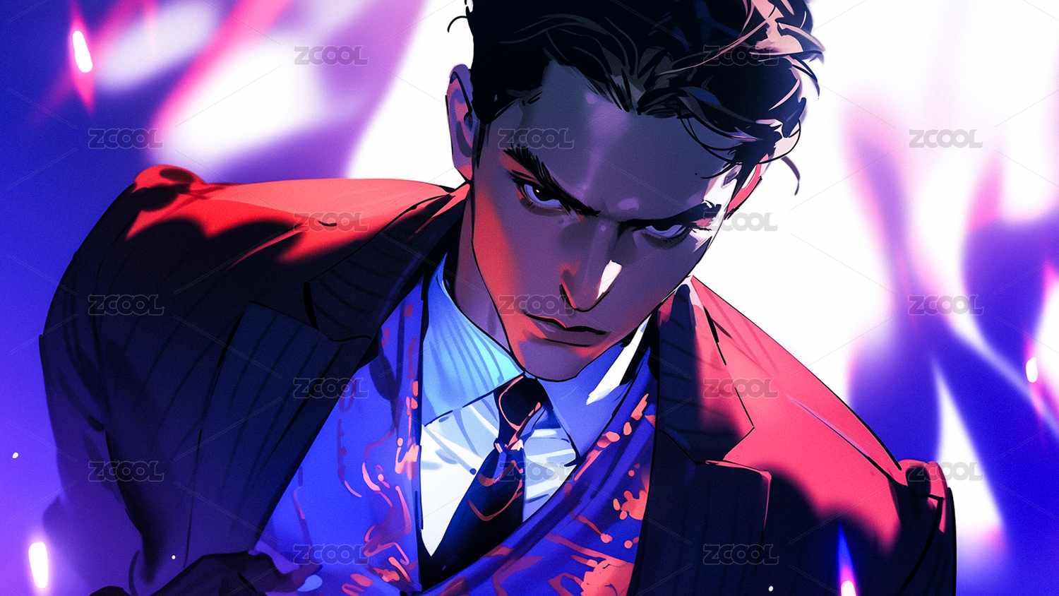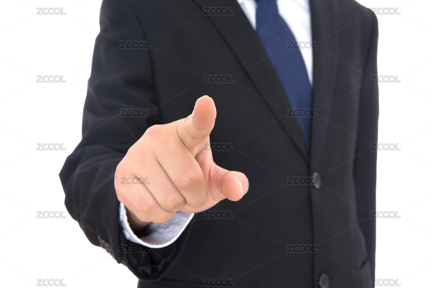 白背景前穿著黑西裝的男性伸出右手做點(diǎn)擊手勢(shì)