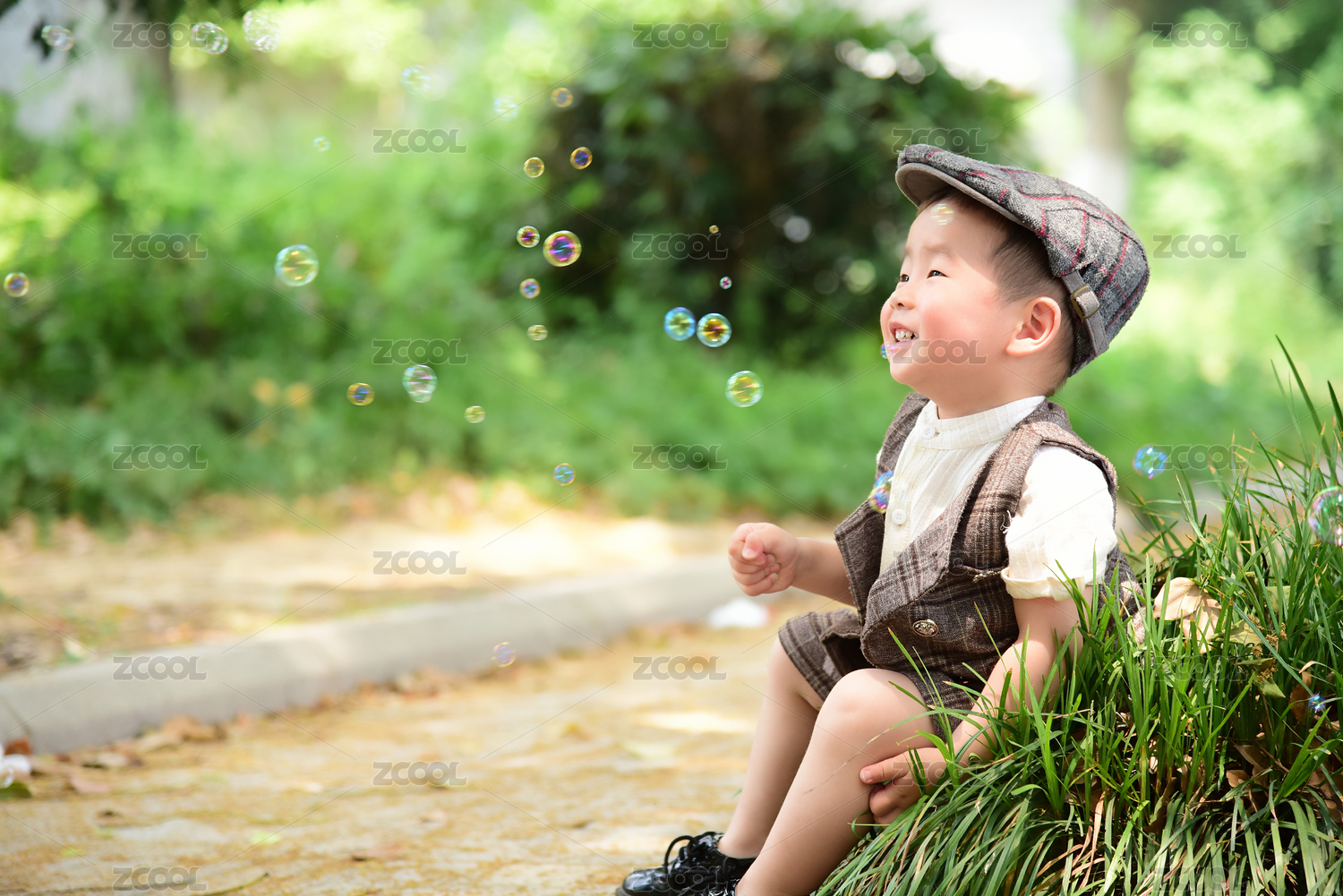 陽(yáng)光下林蔭小路上穿著短袖西服坐在草坪上看著泡泡開(kāi)心的小男孩