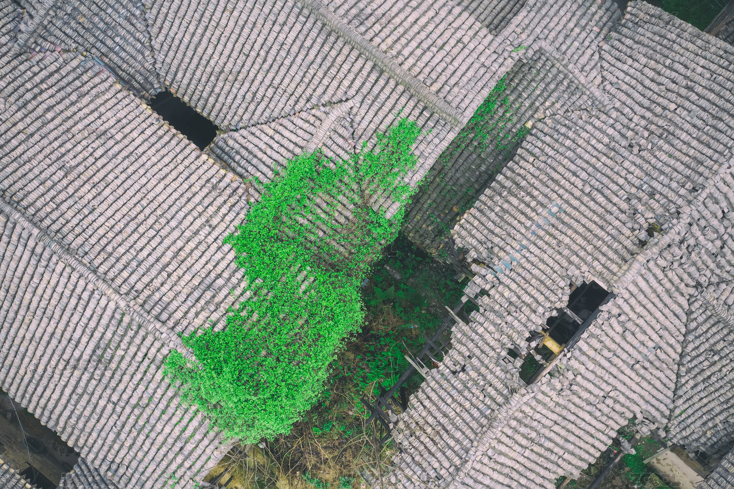 破舊屋檐上長著綠色的野生植物