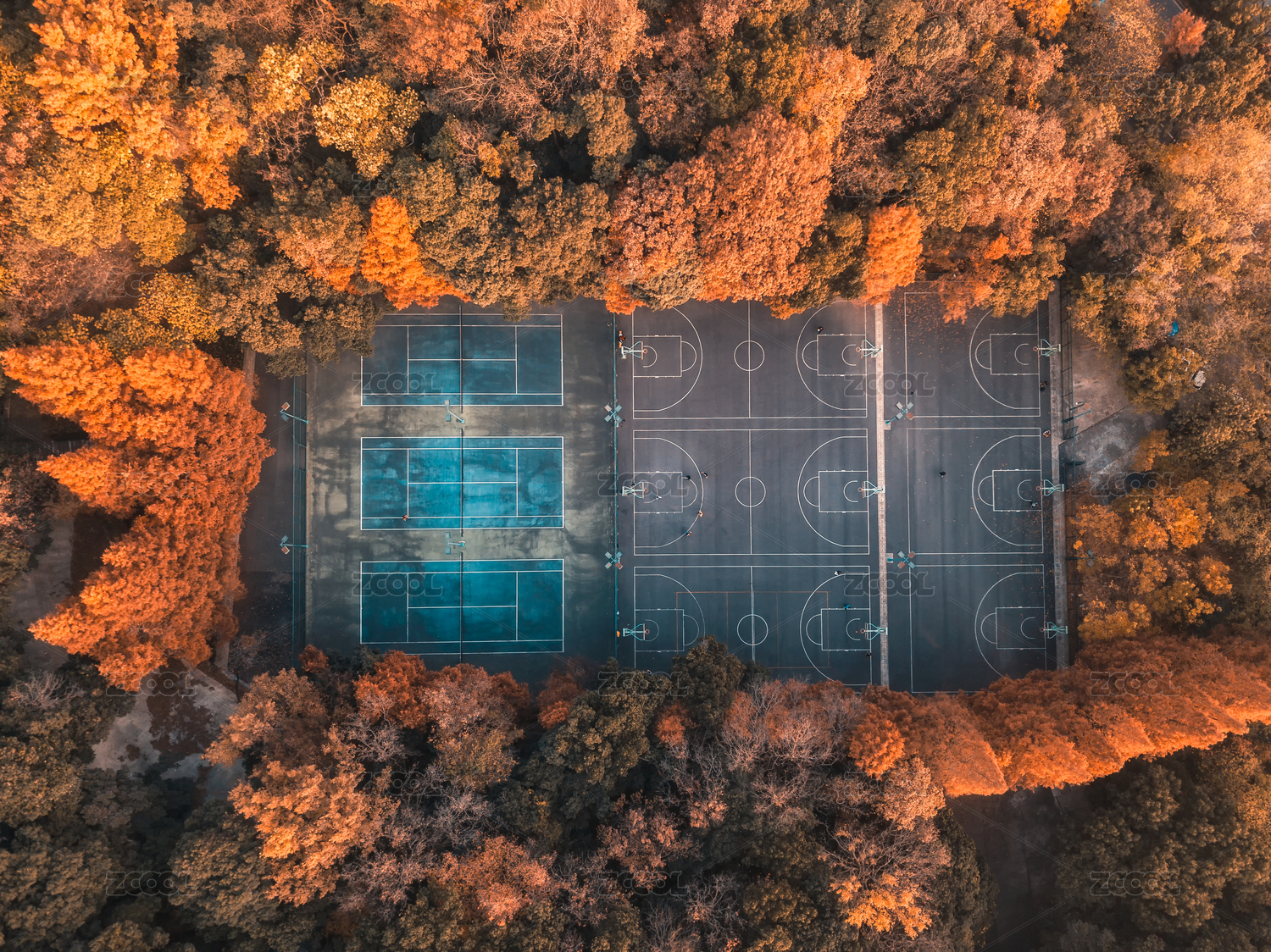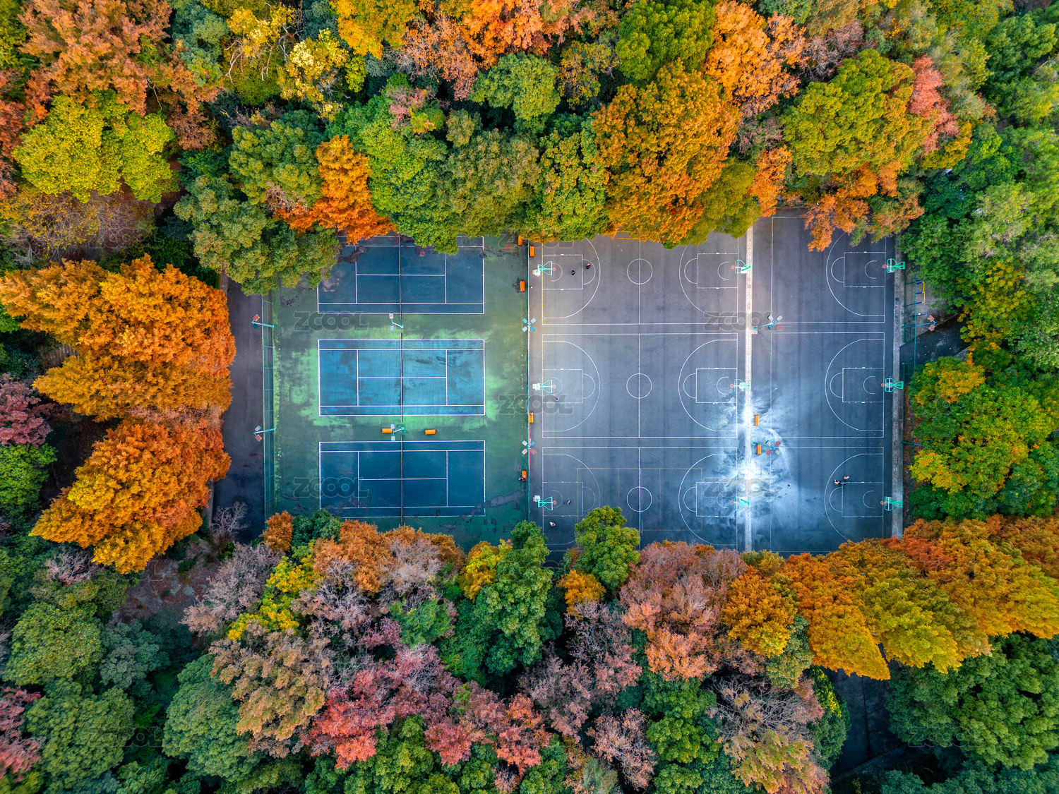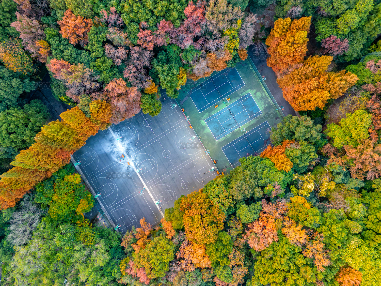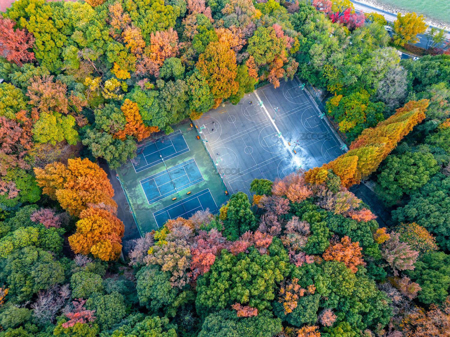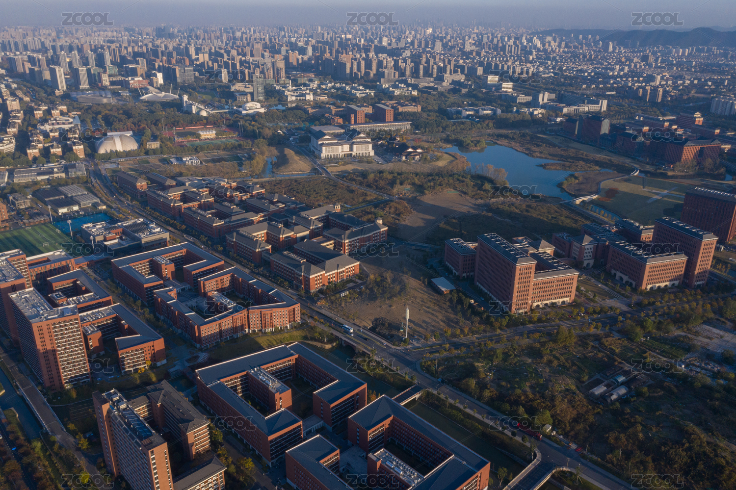中國(guó)杭州浙大之江校區(qū)球場(chǎng)秋景航拍