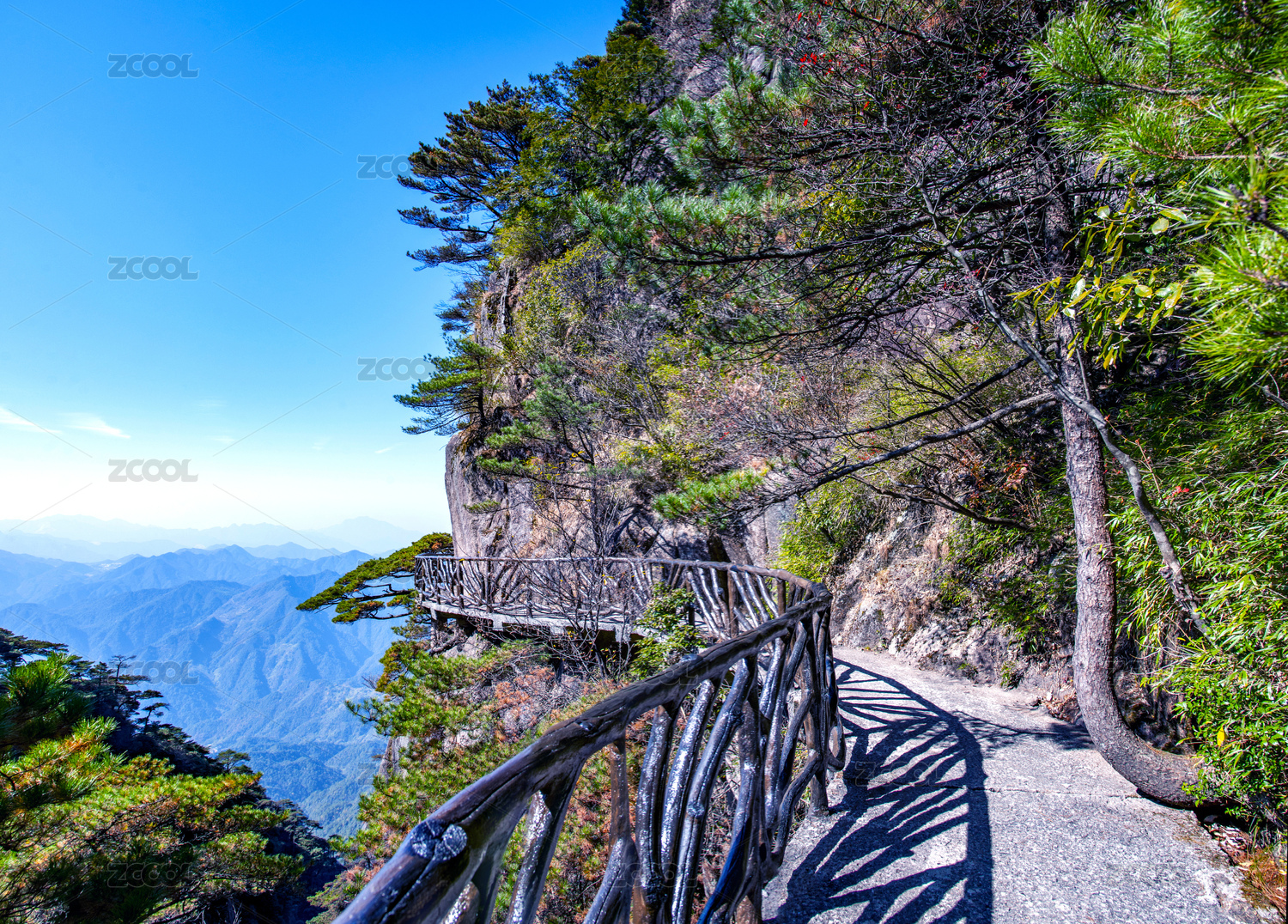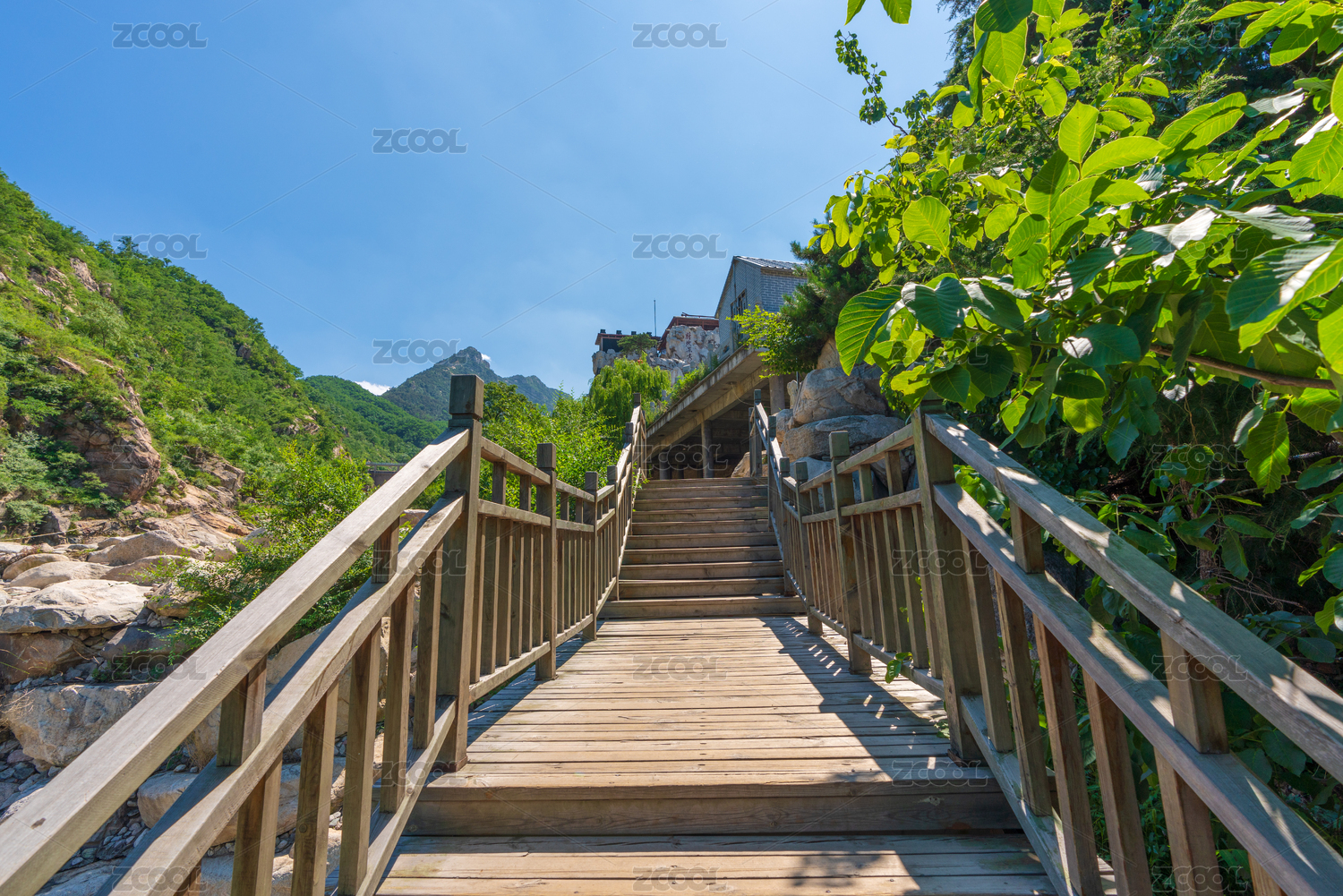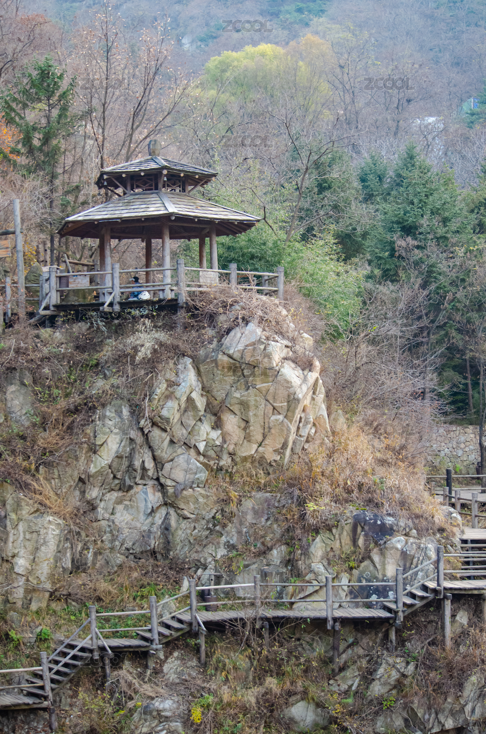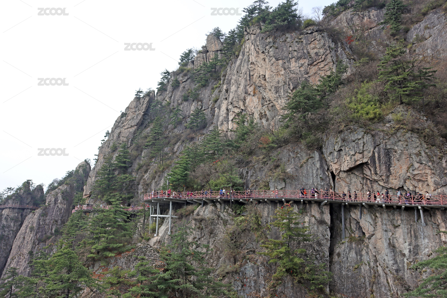 濟(jì)南市九如山紅葉谷懸崖上木制的棧道步行道